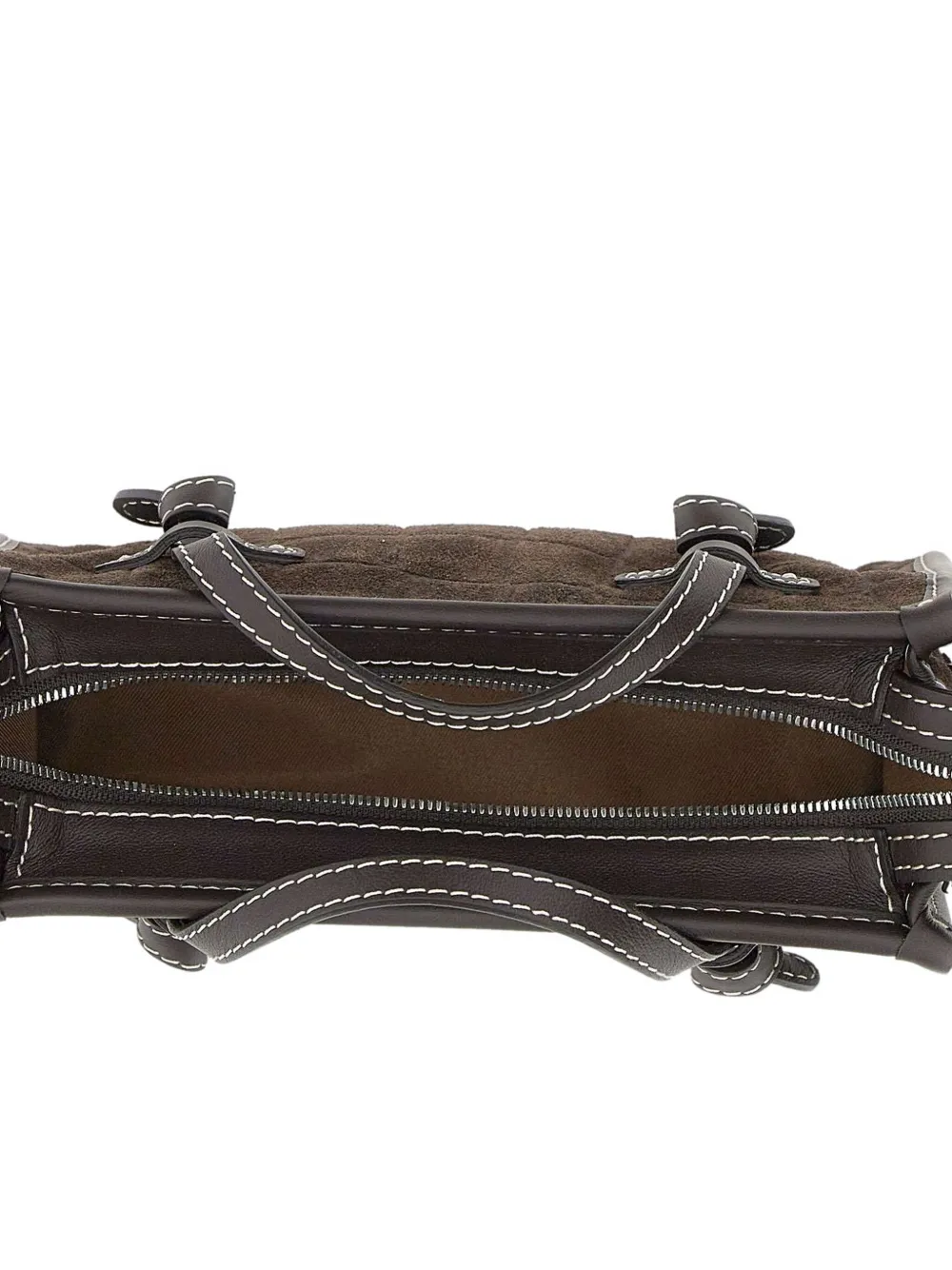 Темно-коричневая текстура с эффектом крокодила, завязанные ремни из кожи, верхние ручки, застежка-молния, контрастная строчка