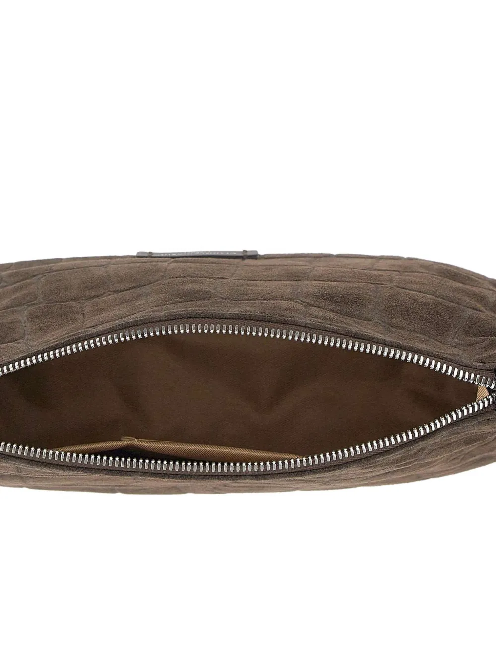 Коричневый верхний застегивается на молнию, основное отделение, ремешок на запястье с тиснением под крокодила