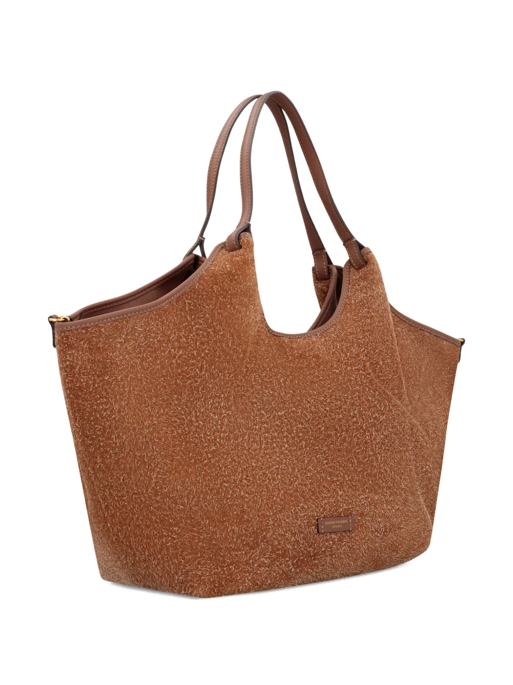 Текстура коричневой замши, верхние ручки, изогнутый силуэт, внутренний карман, застежка-молния