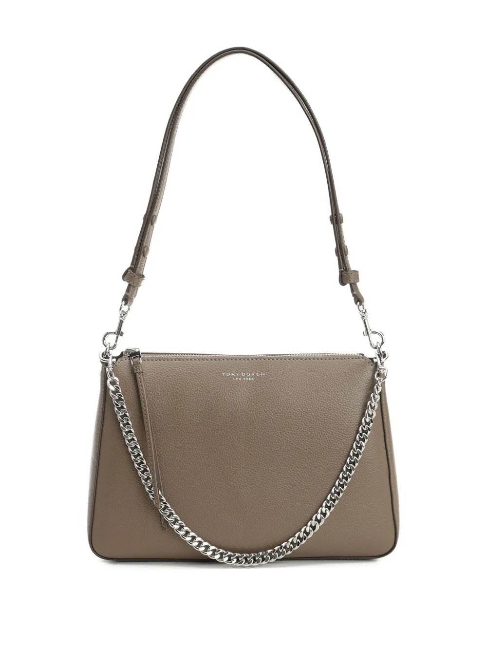Съемный плечевой ремень серо-коричневого цвета, цепочка серебристого тона, надпись-логотип спереди, застежка-молния
