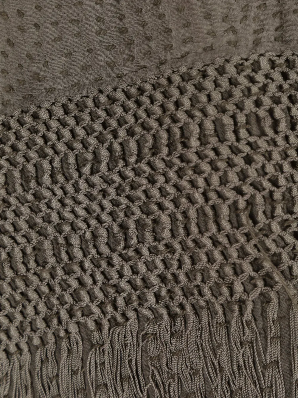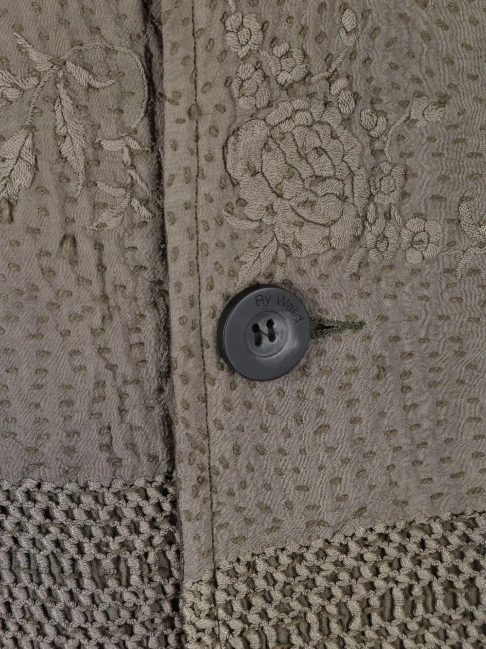 Хаки-коричневый, вышитый цветочный узор, однобортный, застежка на пуговицы, длинные рукава, бахрома по низу, шелк