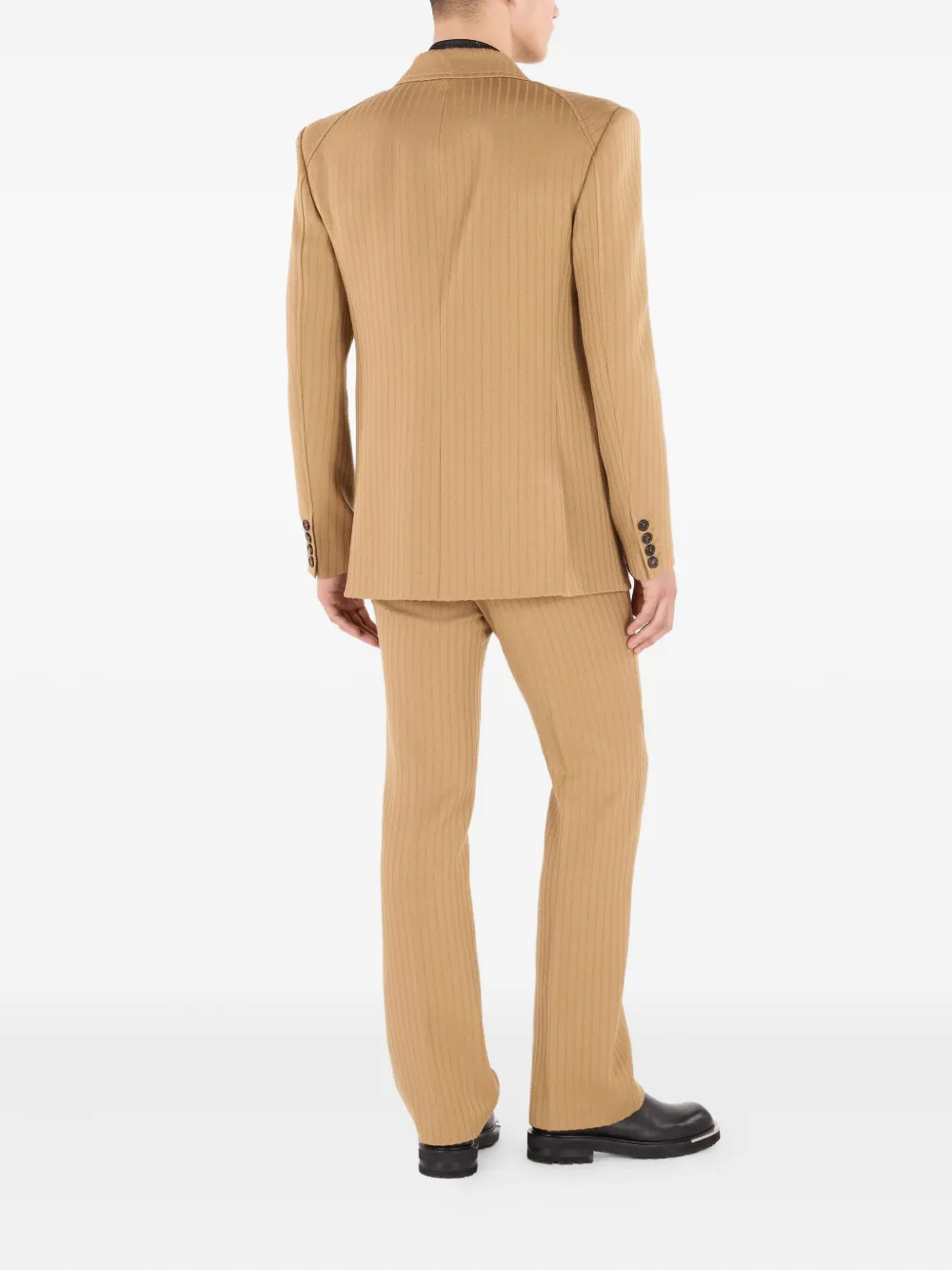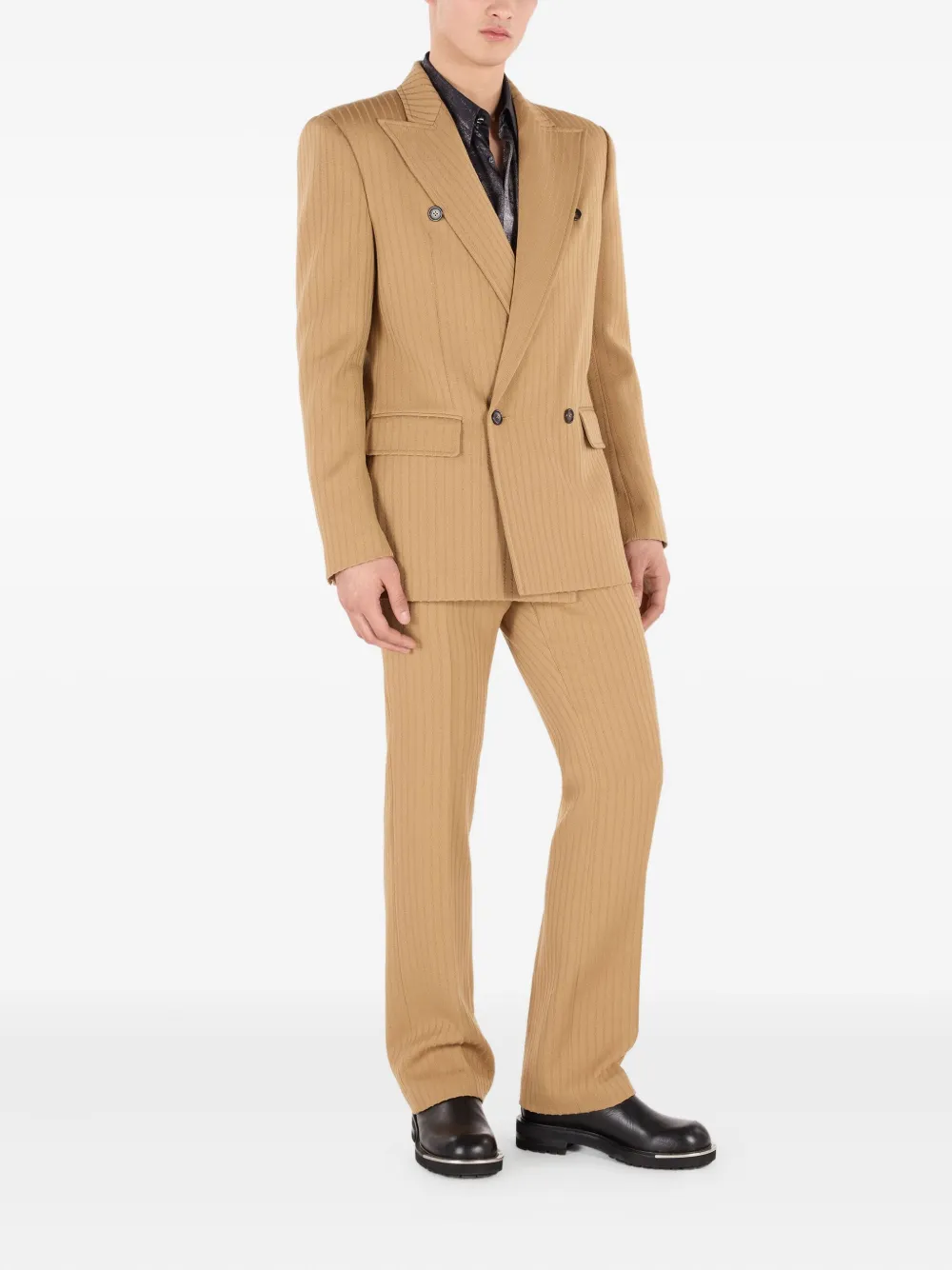 Светло-коричневые вертикальные полосы, двубортный пиджак, застежка, отложной воротник, манжеты на четырех пуговицах