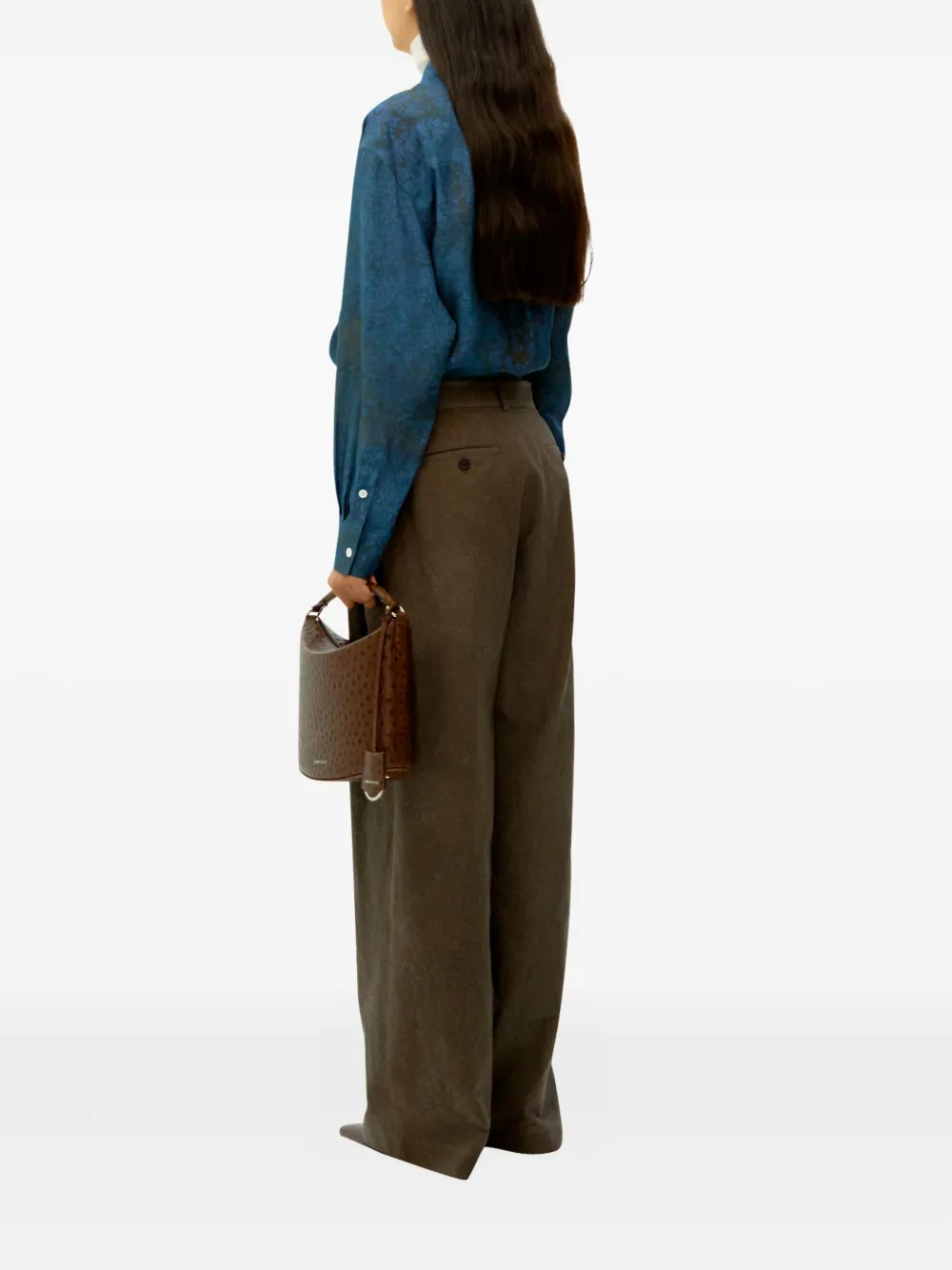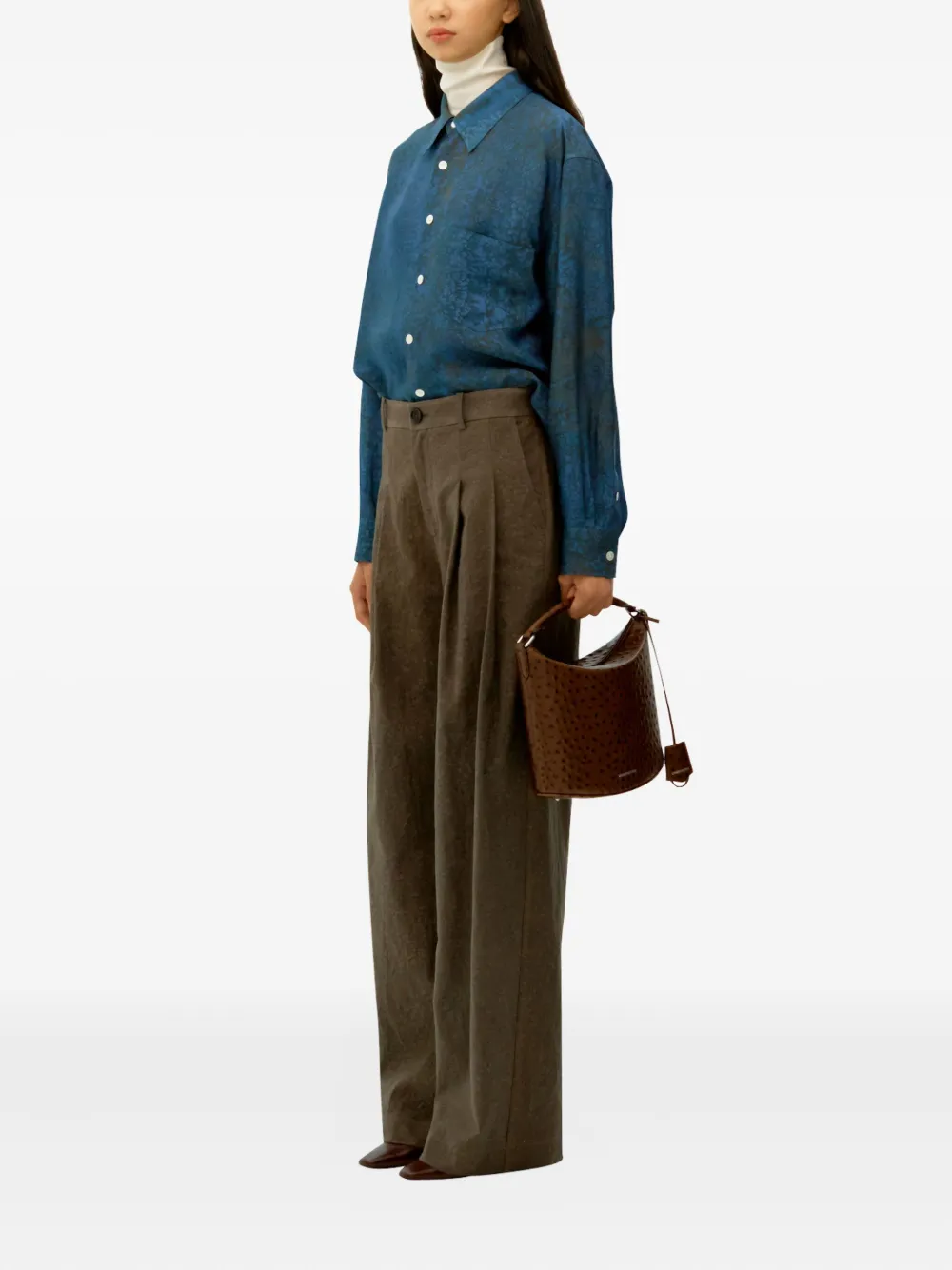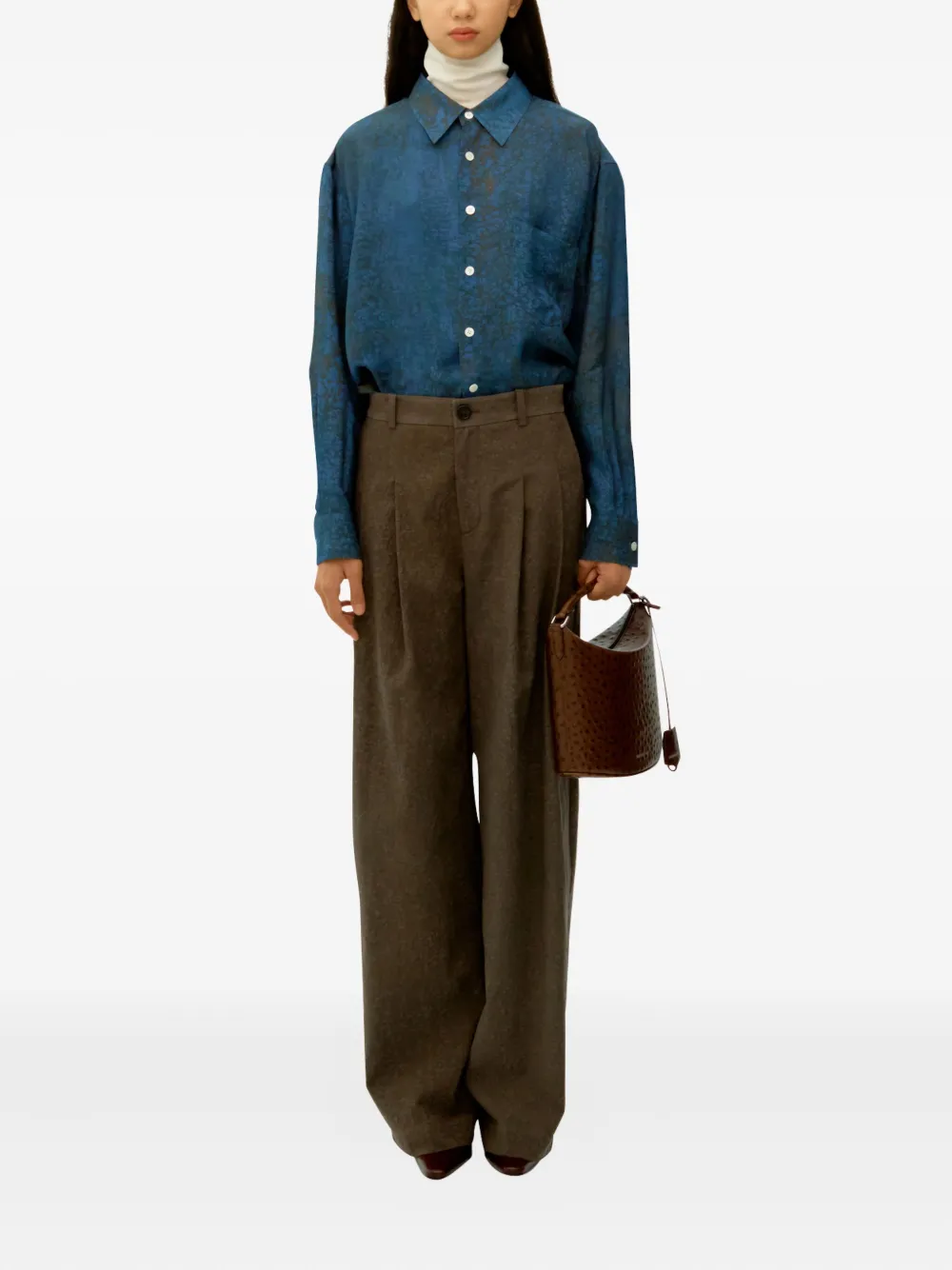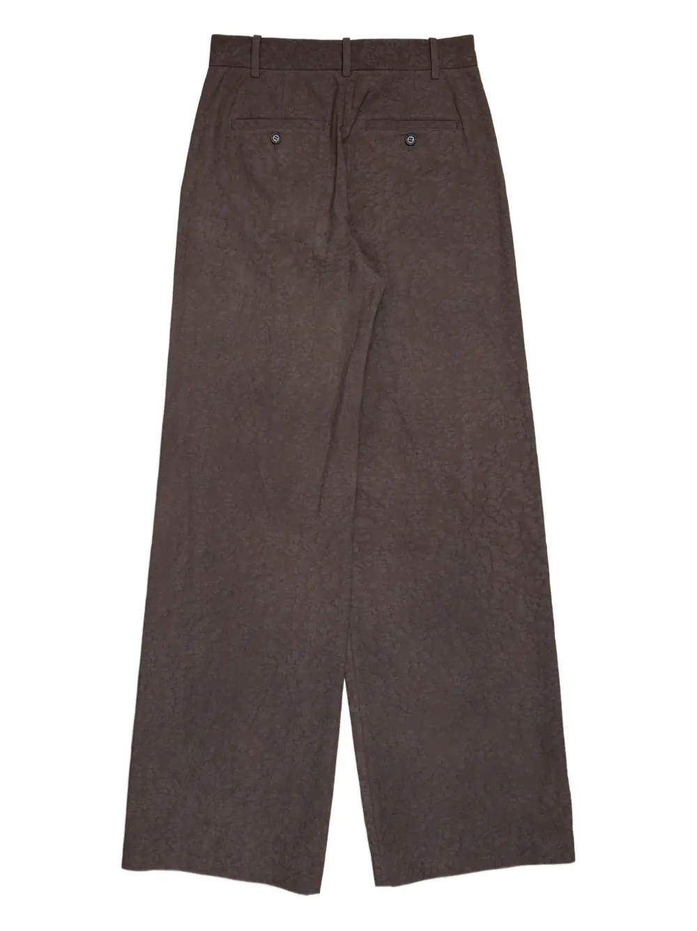 Коричневый крашеный солью хлопок с двумя складками, широкие брючины, плиссировка спереди, фактурный узор по всей поверхности