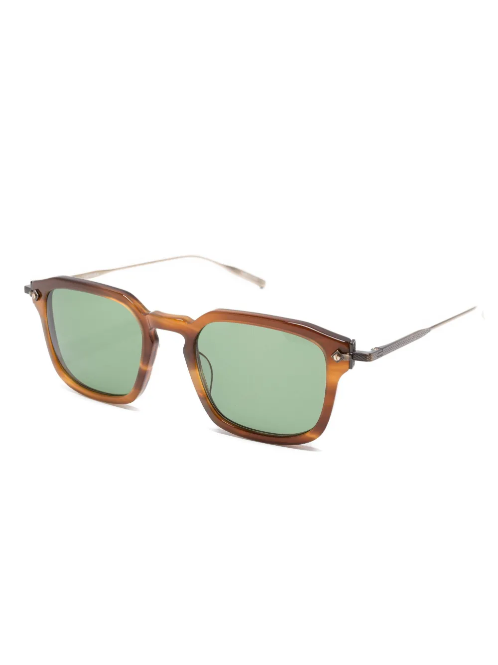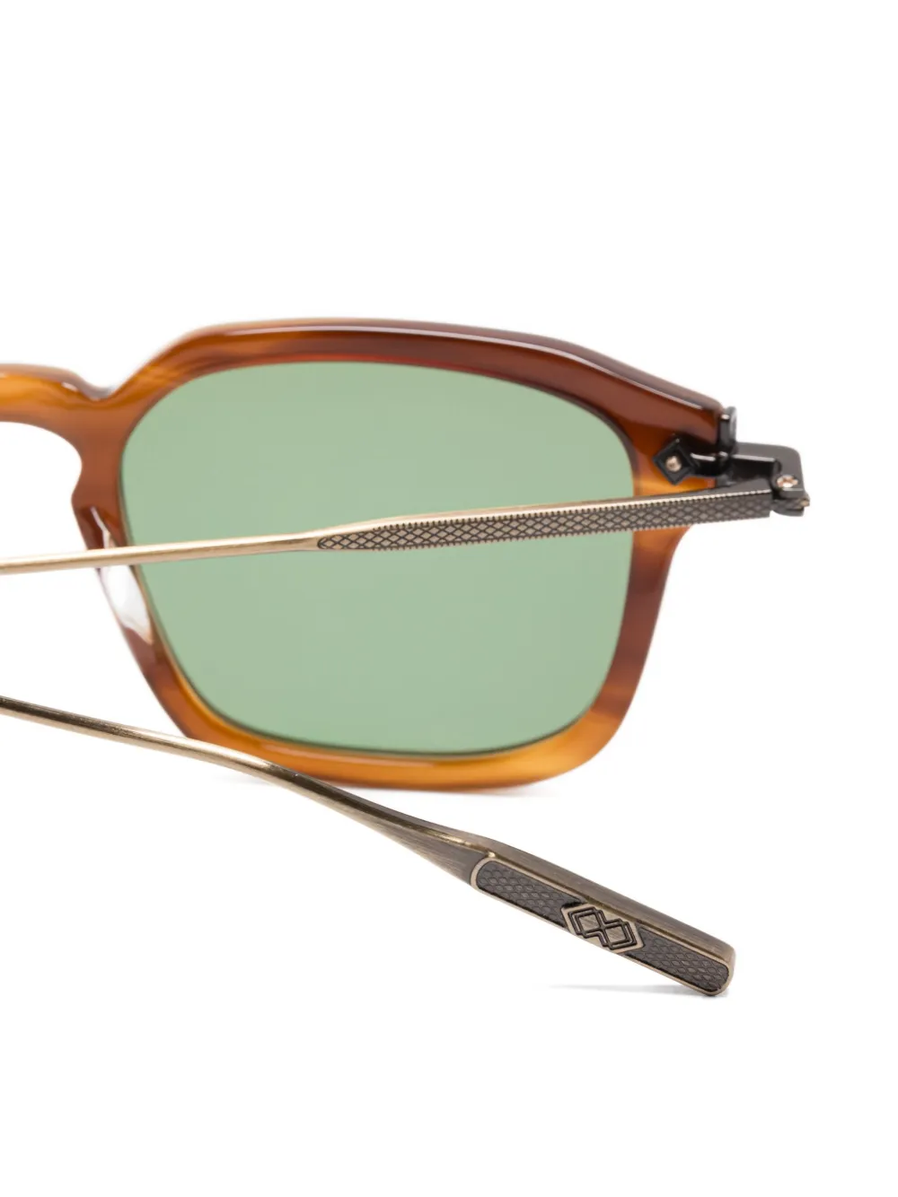 Светло-коричневые, зеленоватые тонированные линзы, квадратная оправа, выгравированный логотип, кончики дужек. Очки поставляются с защитным футляром.