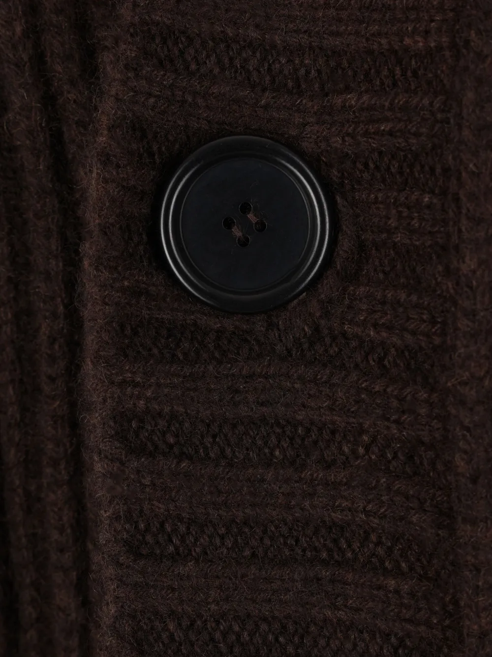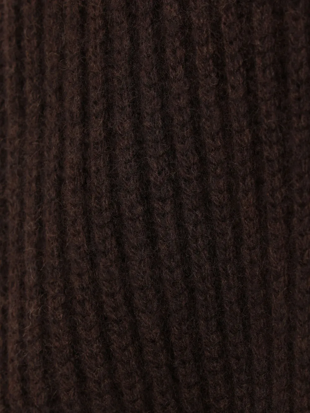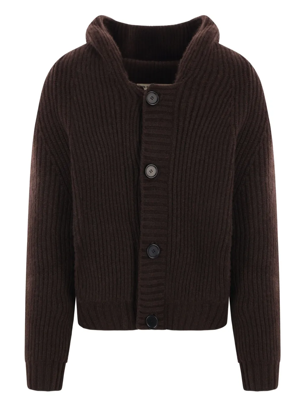 Темно-коричневый кашемировый трикотаж в рубчик, застежка на пуговицы, капюшон, вырез горловины, боковые карманы