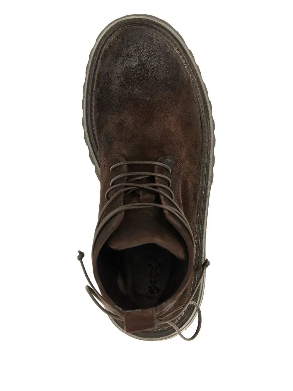 Коричневая шнуровка спереди, круглый носок, фирменная стелька, язычок на пятке