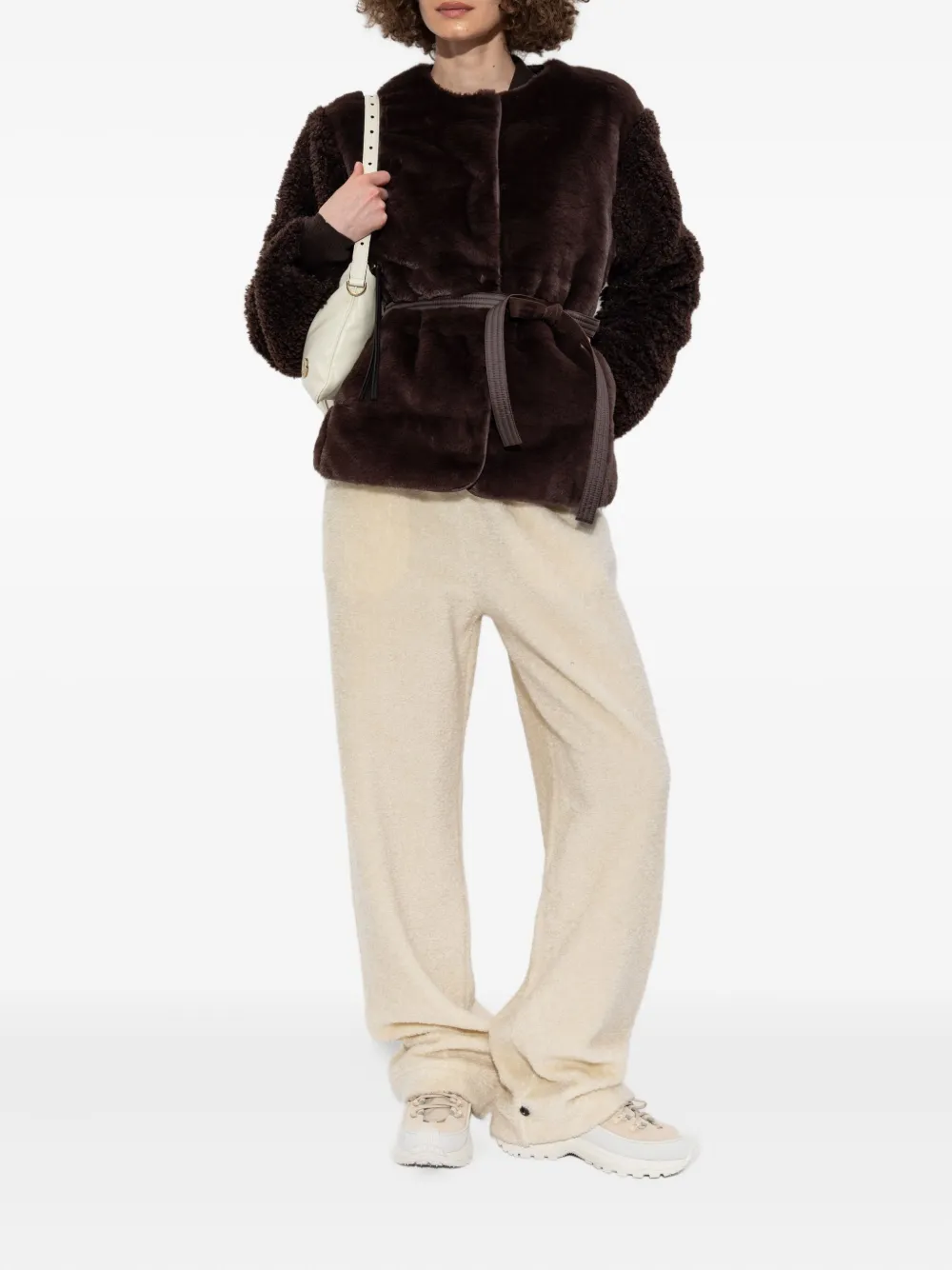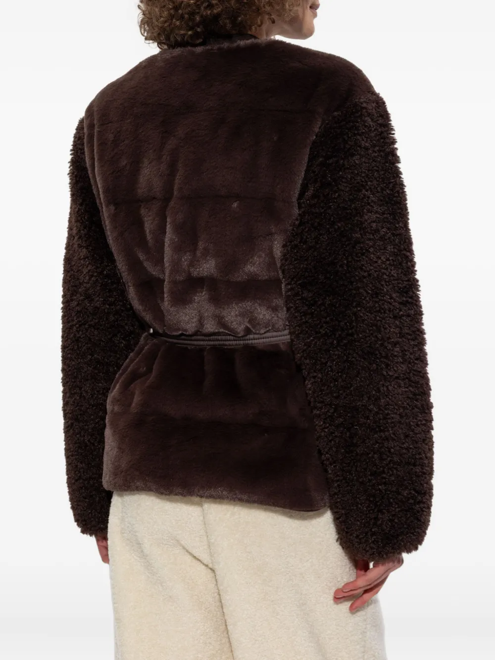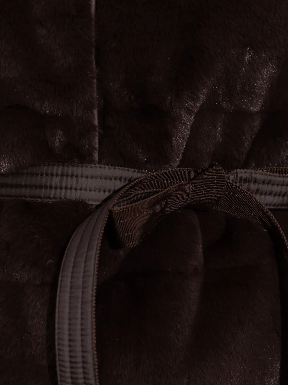Коричневый искусственный мех, завязывается на талии и застегивается на кнопки