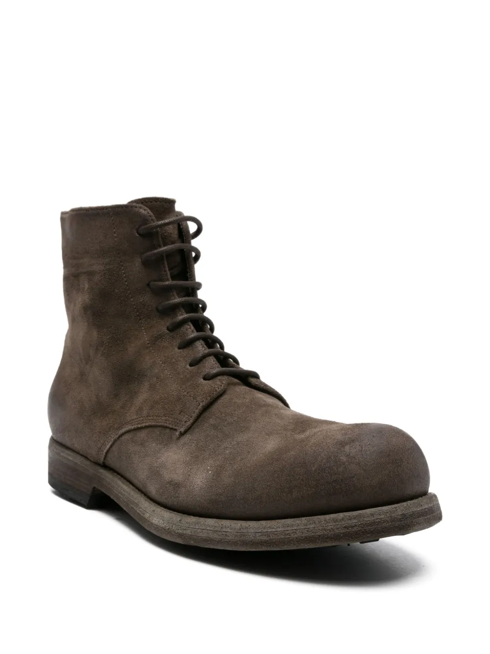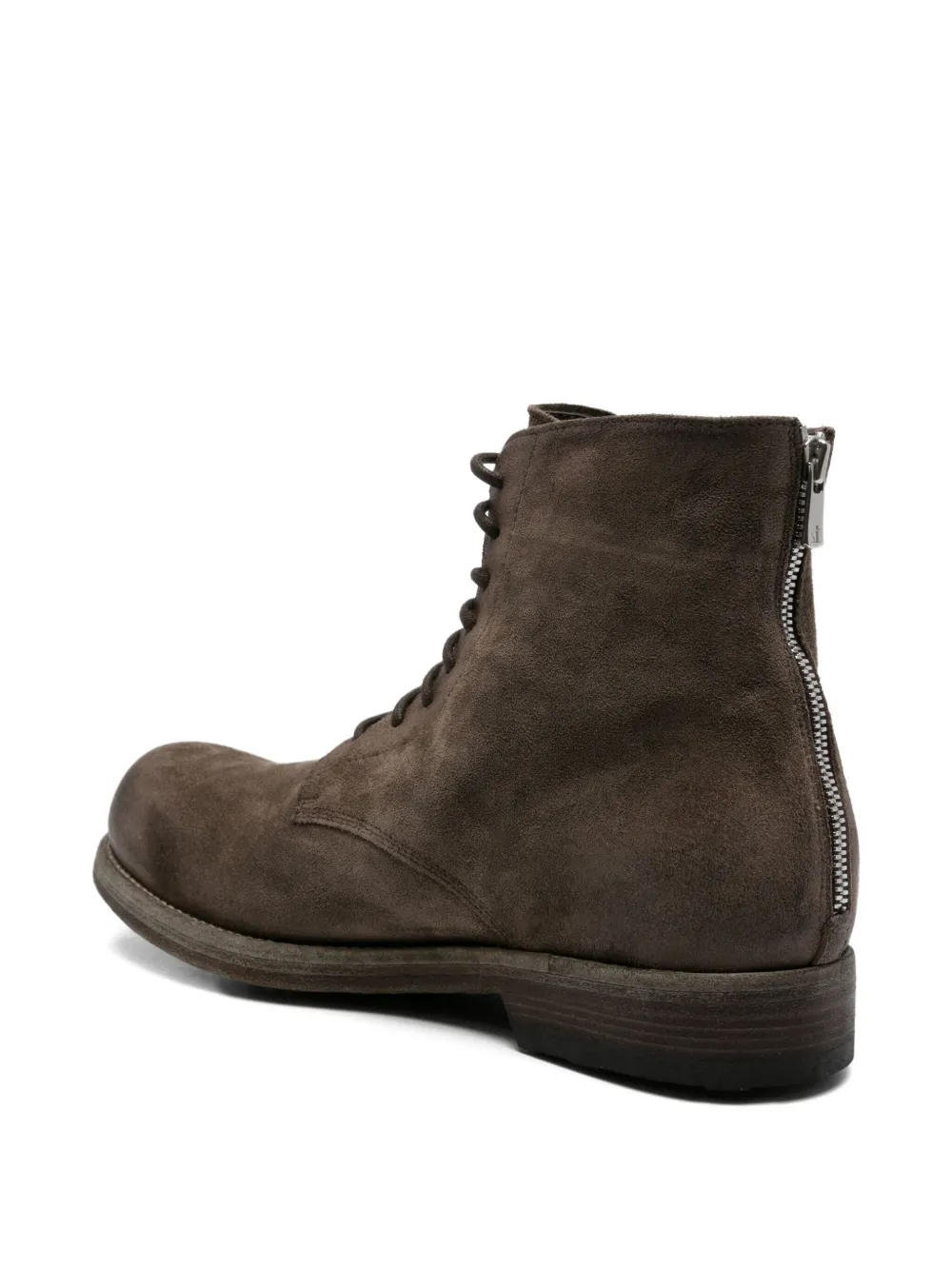 Оливково-коричневого цвета, шнуровка, застежка-молния сзади, круглый носок