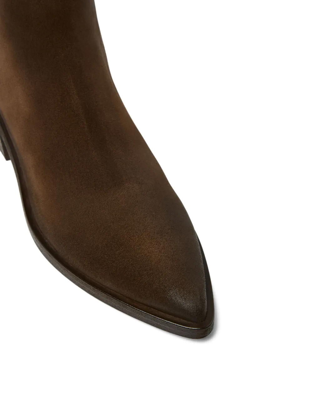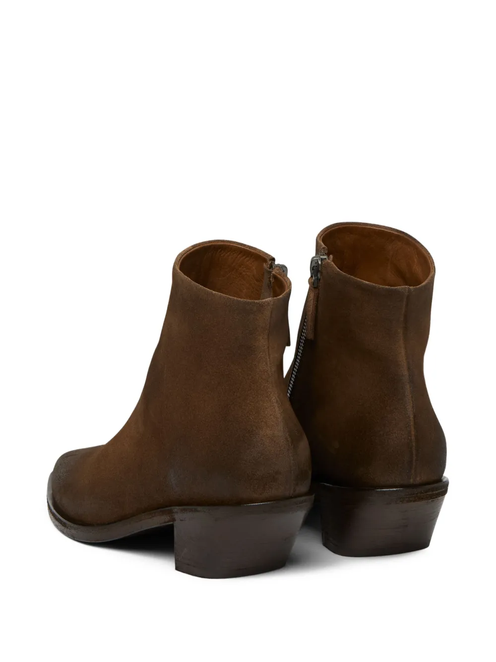 Коричневая замшевая отделка, острый нос, низкий блочный каблук, высота до щиколотки, застежка-молния сбоку