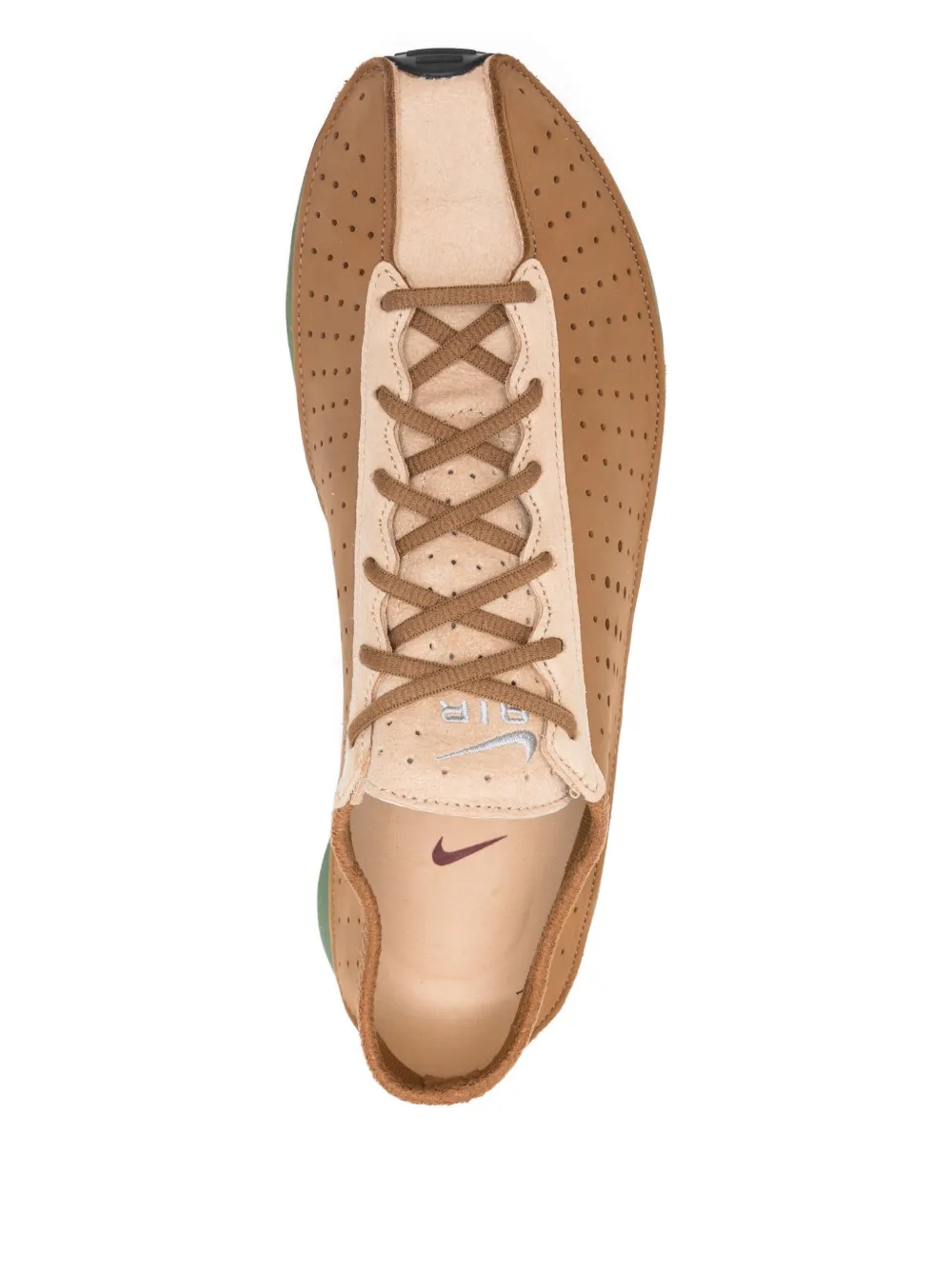 Коричневая перфорированная деталь, шнуровка, зеленая резиновая подошва, низкий верх