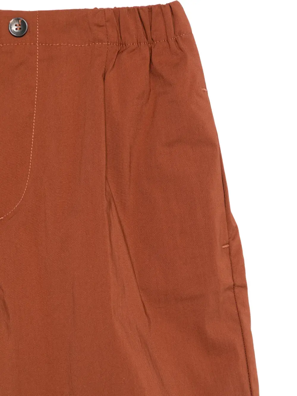 Коричневые складки, эластичный пояс, застежка на пуговицы, боковые карманы, задние карманы