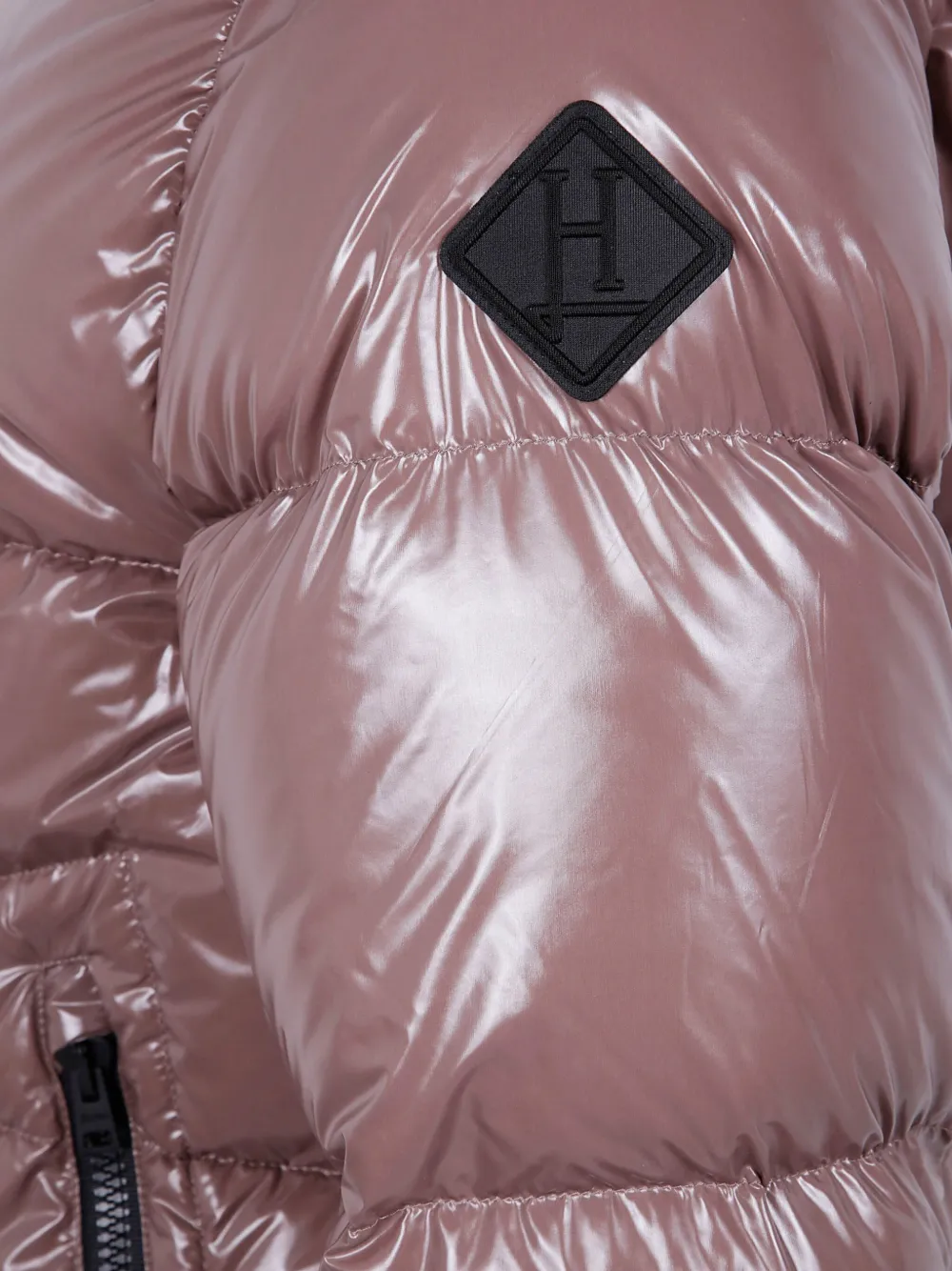 Коричневый стеганый дизайн, высокий ворот, потайная застежка-молния, нашивка с логотипом, капюшон