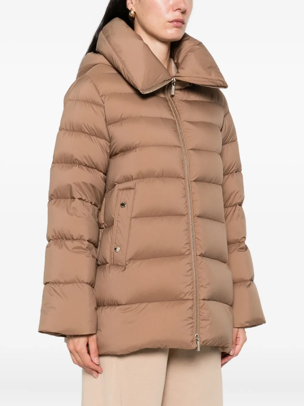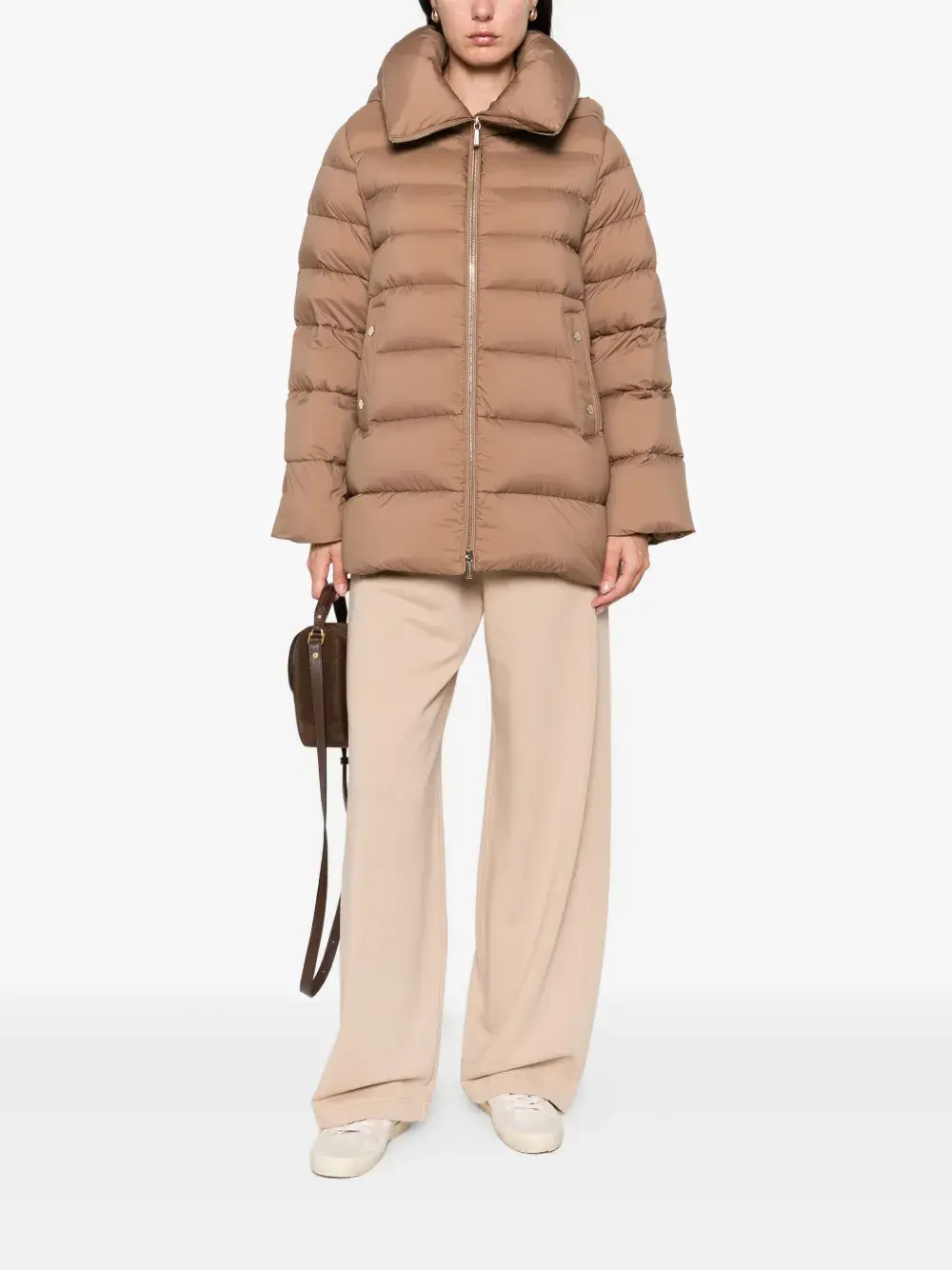 Стеганый коричневый верблюжий цвет, капюшон, застежка-молния, прорезные карманы