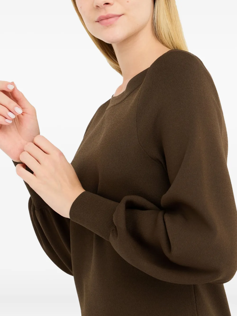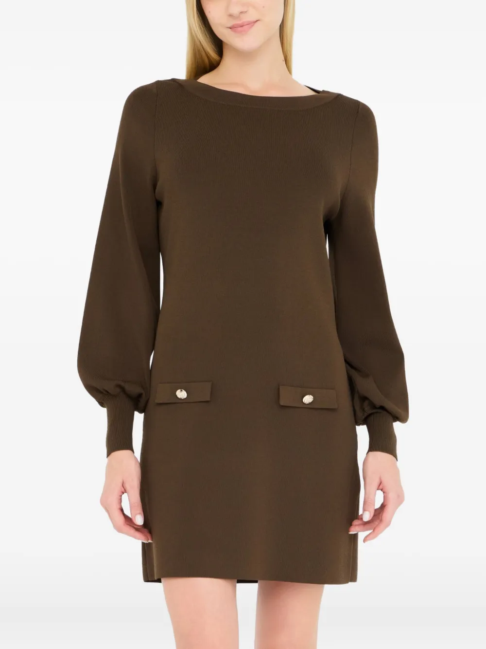 Коричневый вырез лодочкой, рукава-фонарики, карманы с клапанами, золотистые пуговицы, ребристая вязка