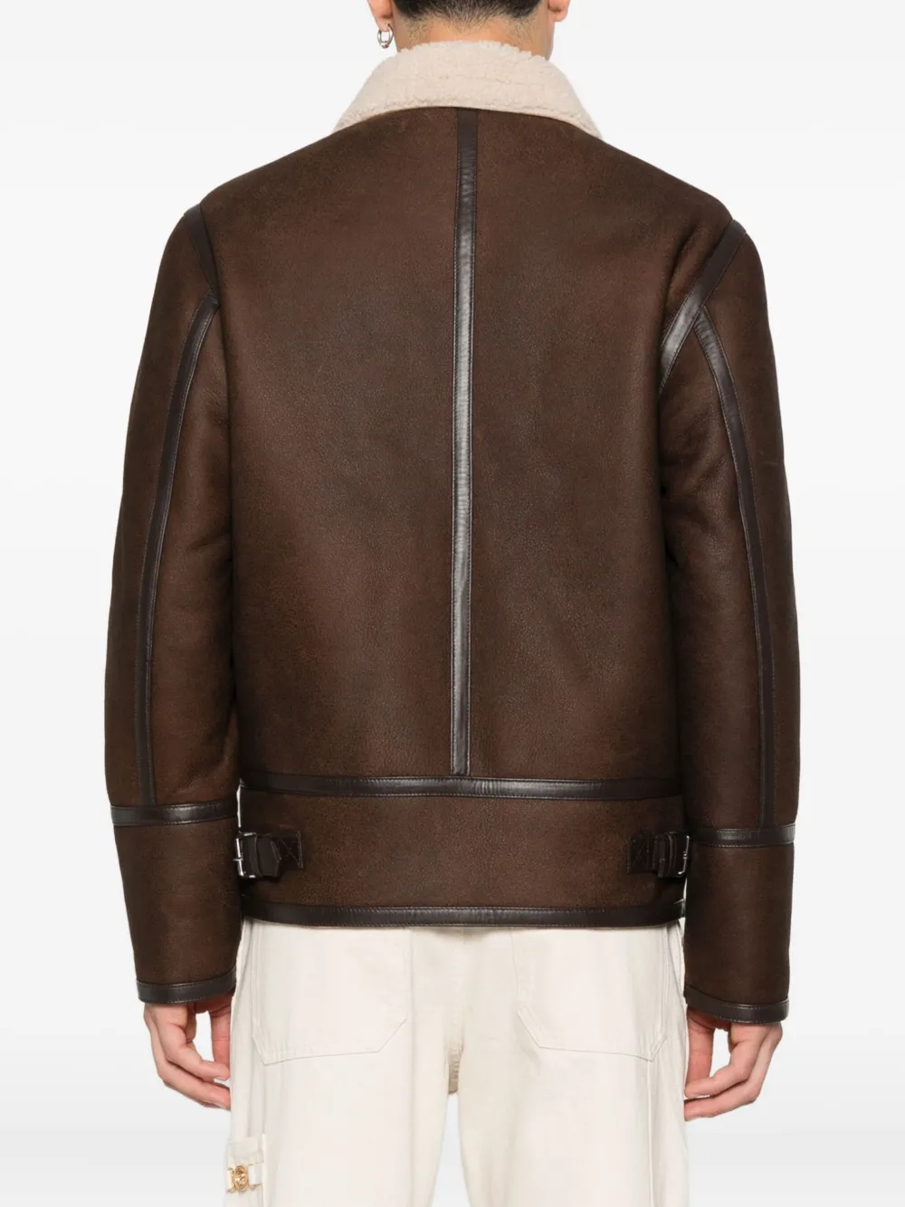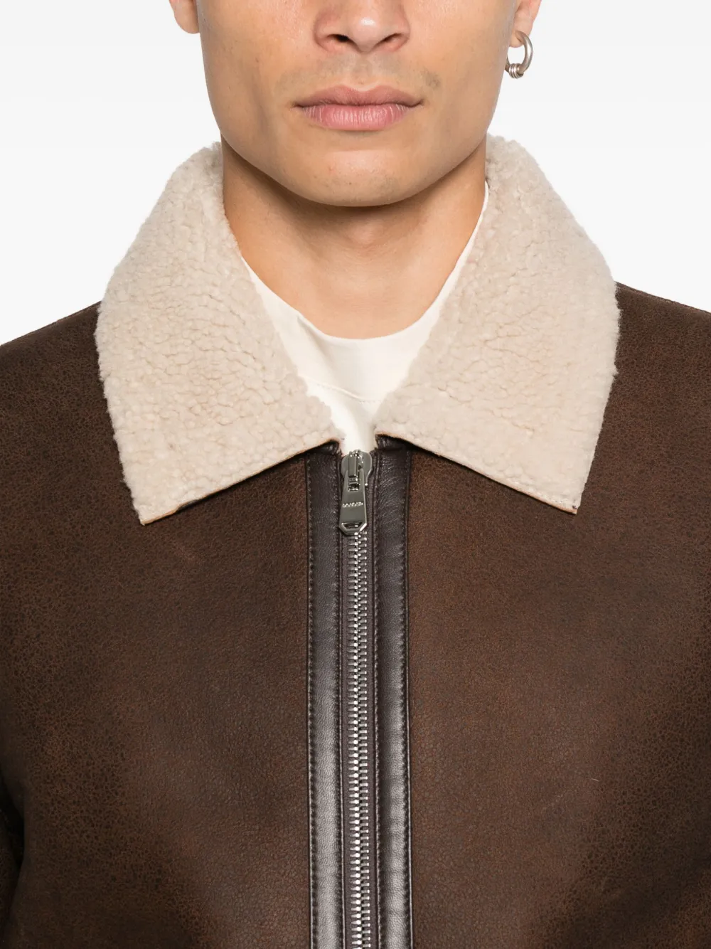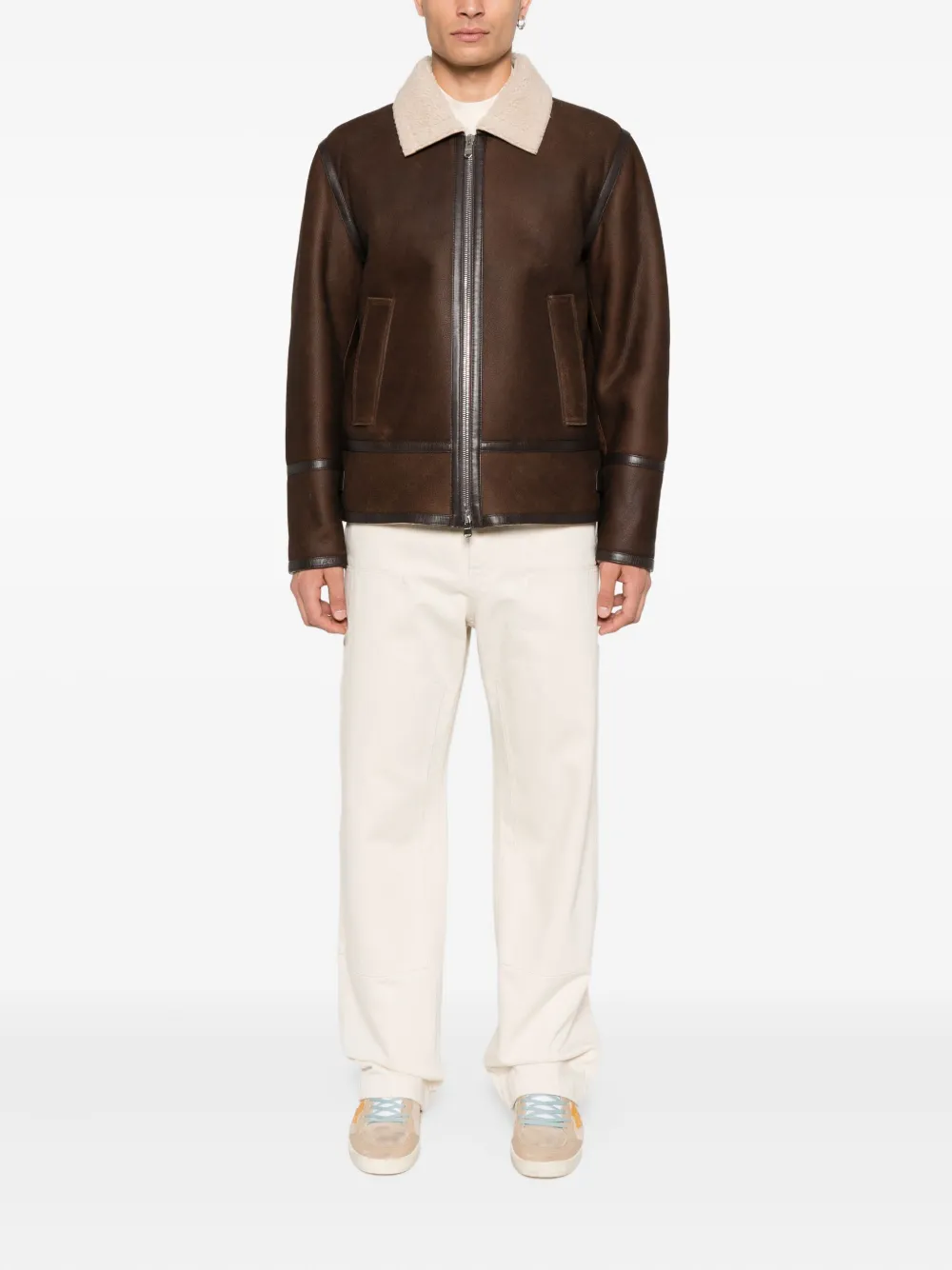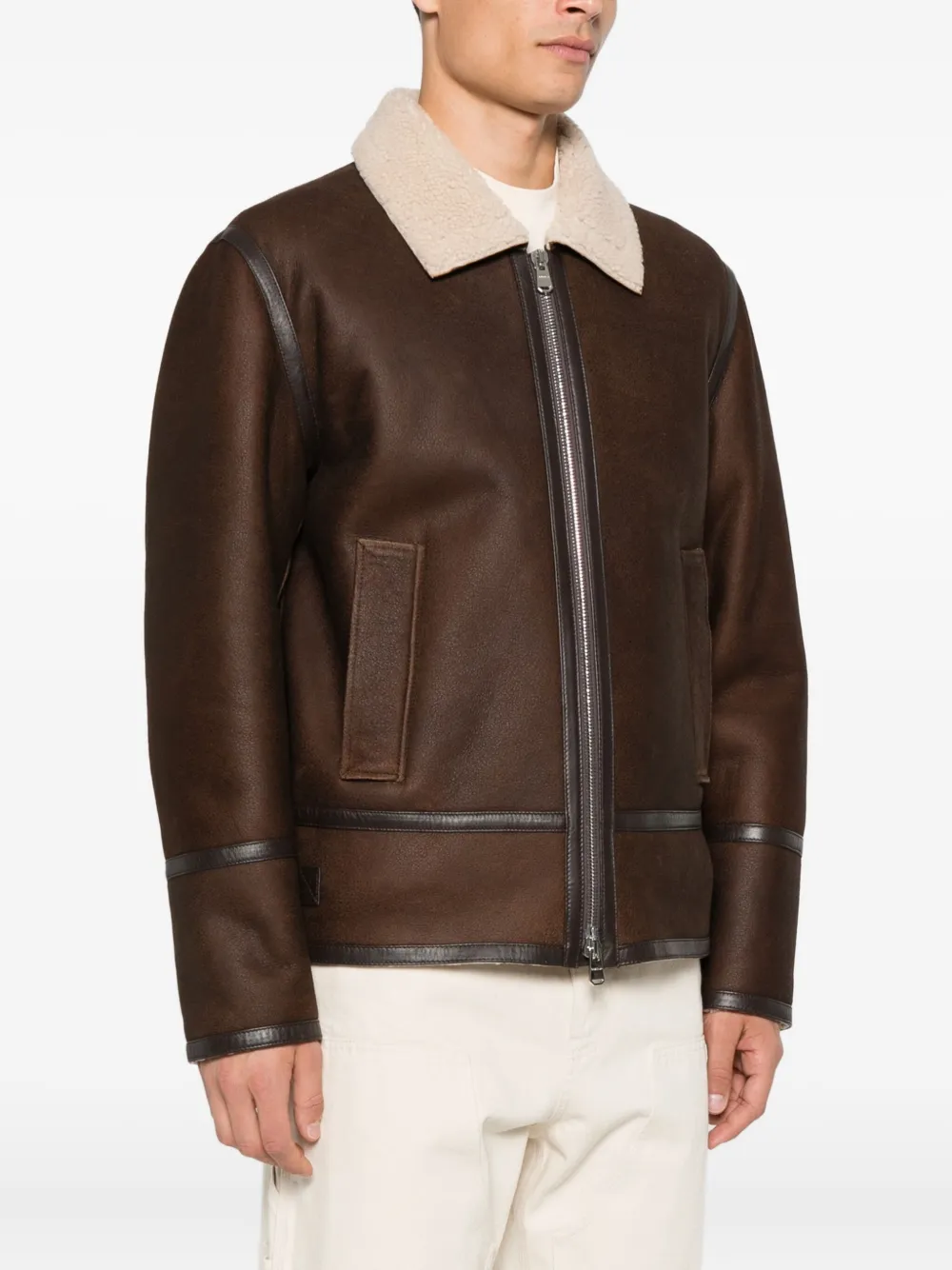 Коричневая овчина, застежка-молния, воротник из овчины, прорезные карманы, кожаная отделка