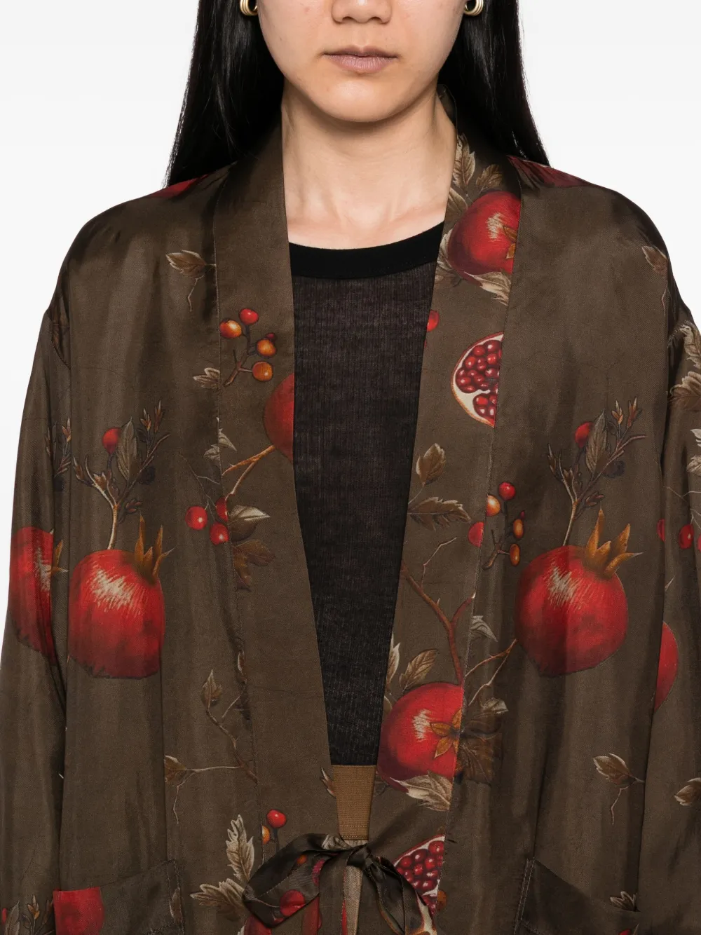 Кедрово-коричневого цвета, завязка спереди, два накладных кармана по бокам, длинные рукава