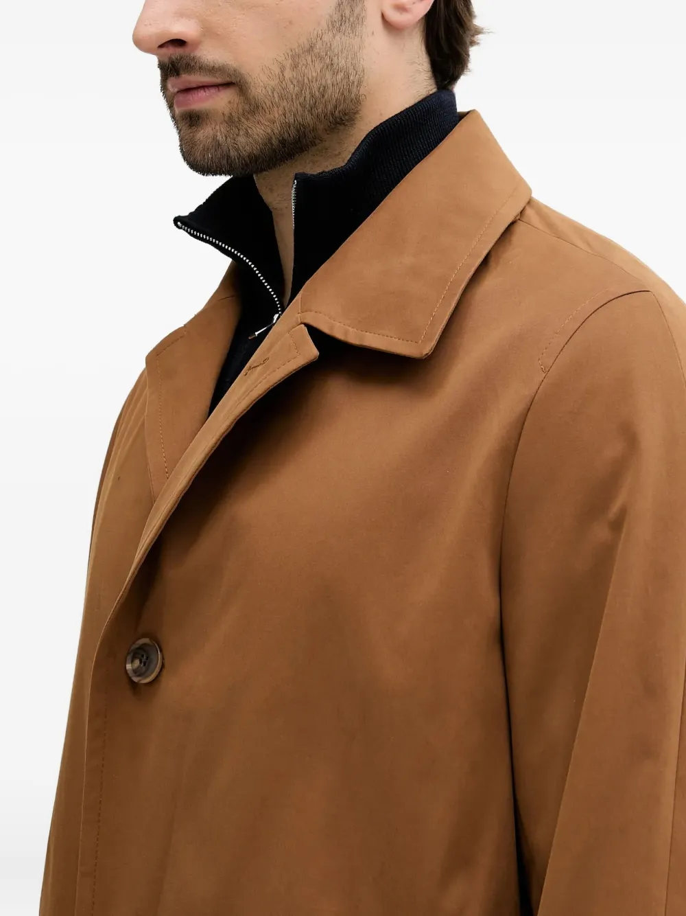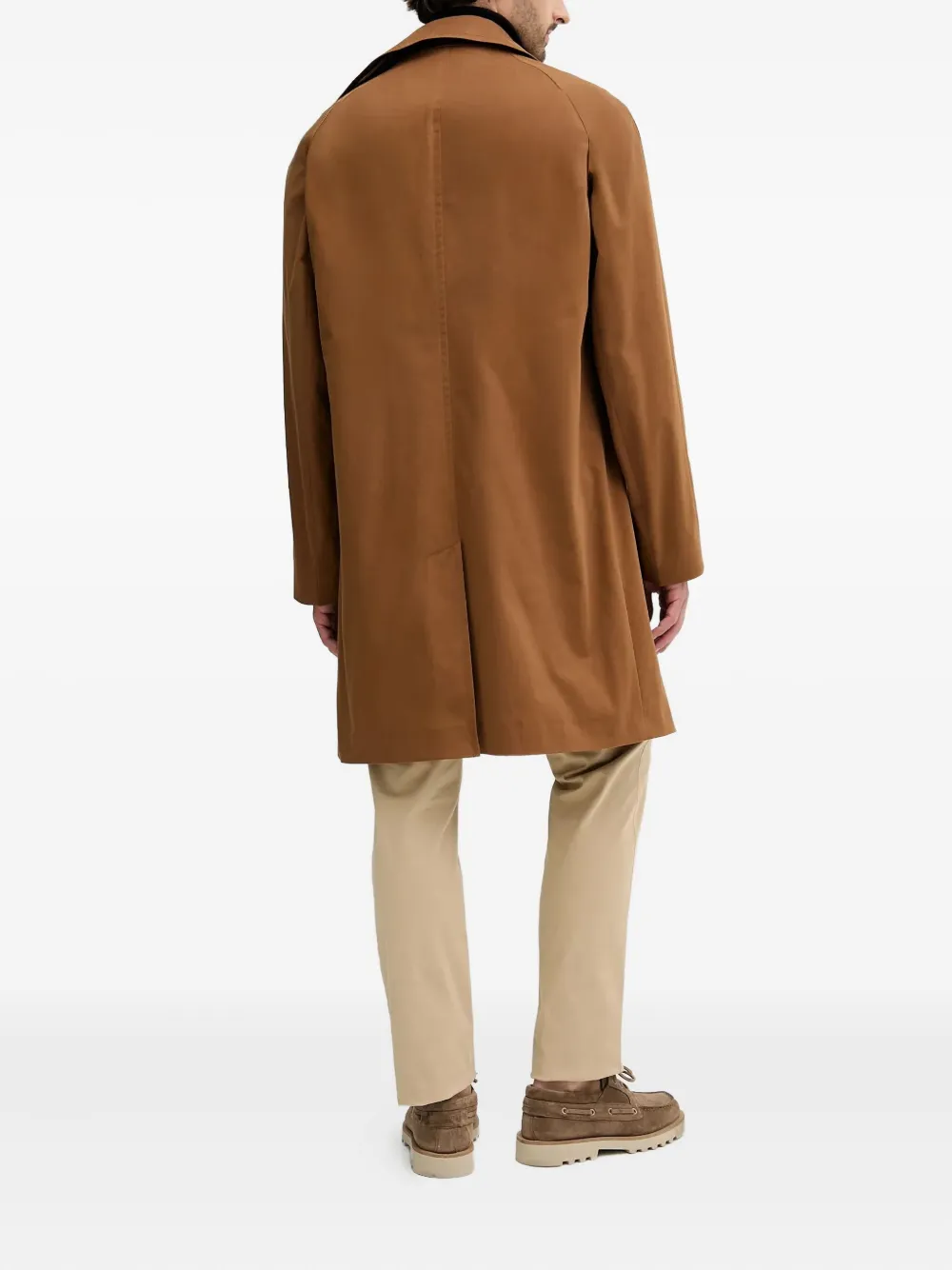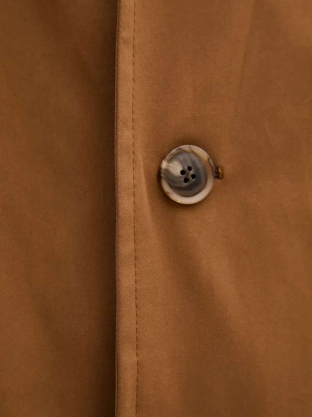 Коричневые пуговицы, заостренные лацканы, длинные рукава, прямой подол, прорезные карманы