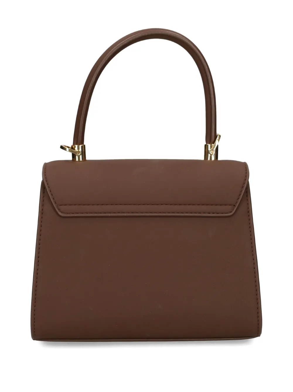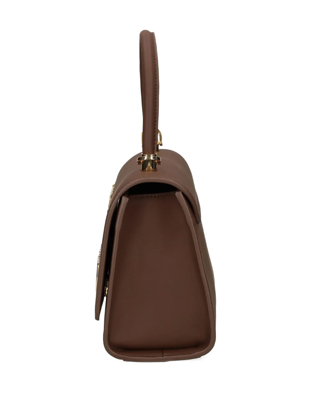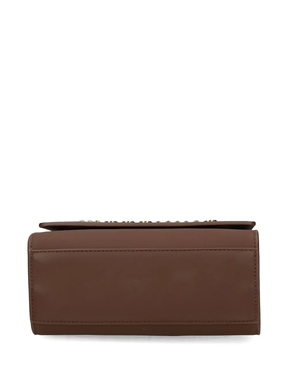Коричневая пластинка с логотипом, золотистая фурнитура, верхняя ручка, застежка-клапан, съемный плечевой ремень