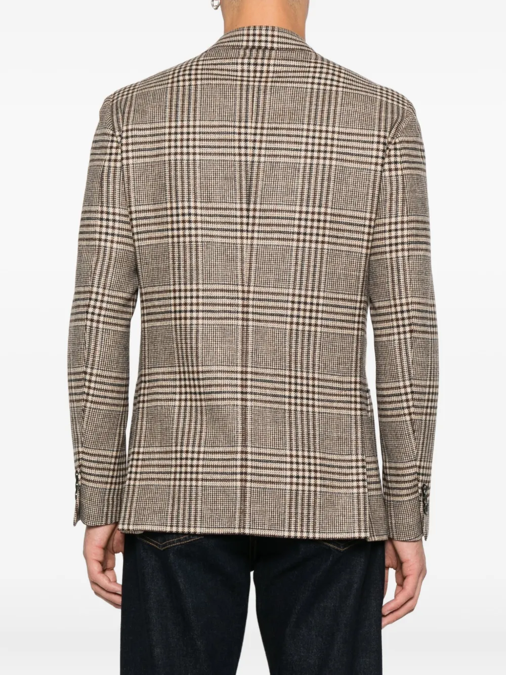 Коричневый клетчатый узор, застежка на две пуговицы, отложной воротник, длинные рукава, прямой подол