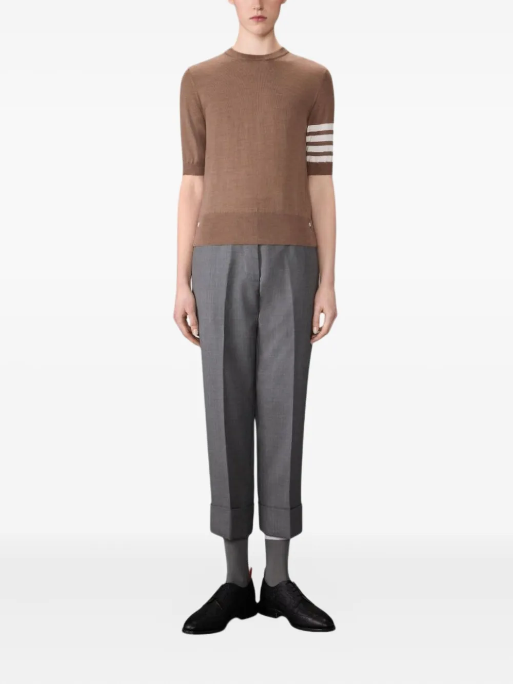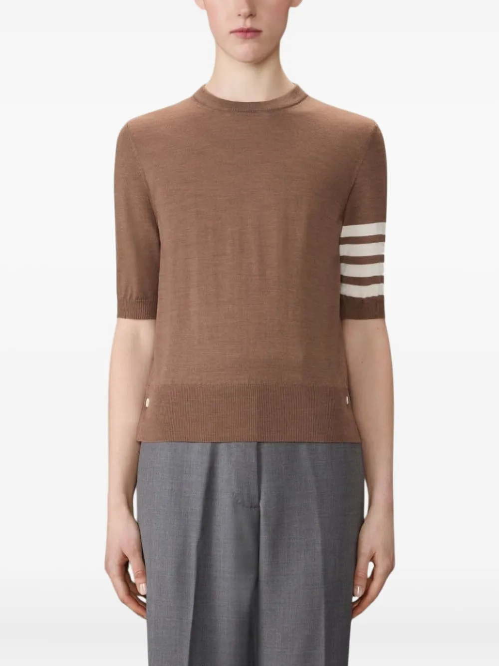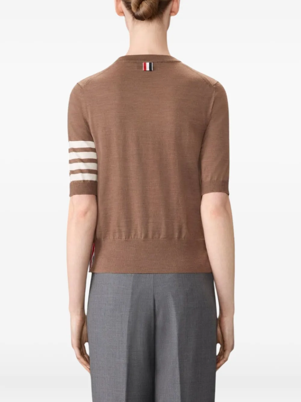 Коричневый с короткими рукавами, круглым вырезом, фирменной деталью в виде четырех полосок, шерстяной смесью