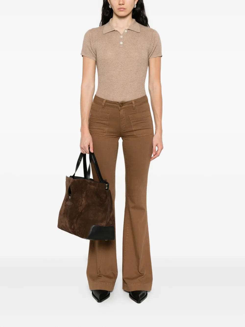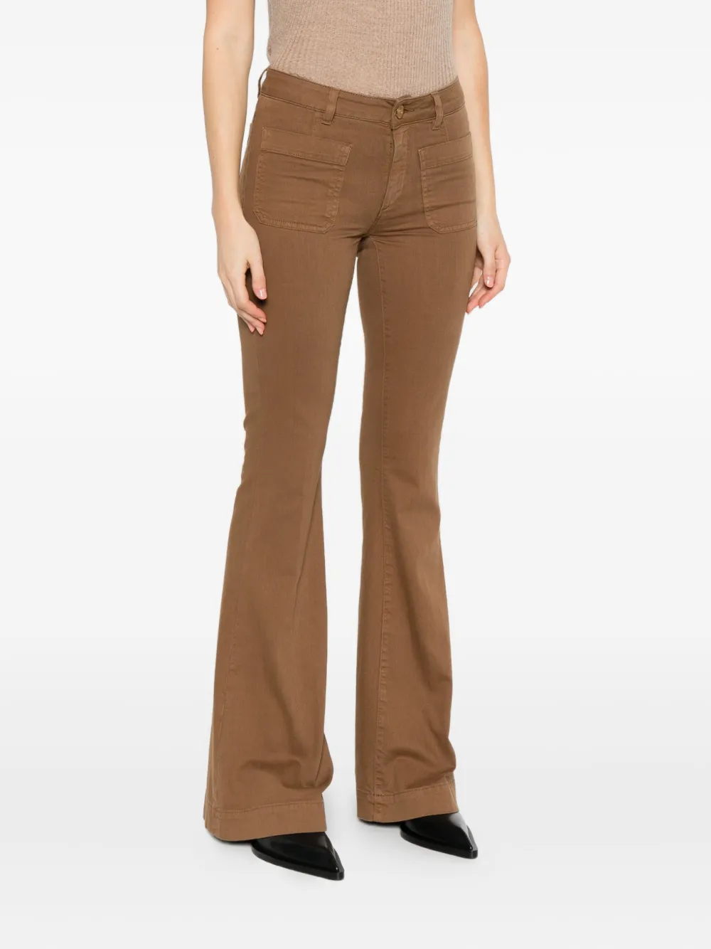 Коричневые расклешенные штанины, передние карманы, застежка на пуговицы