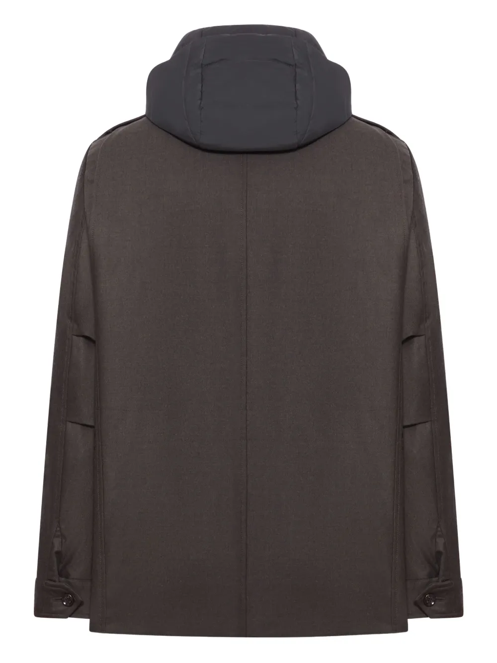 Коричневая потайная застежка-молния, регулируемый капюшон на шнурке, четыре кармана с клапанами, манжеты на пуговицах, съемный стеганый жилет
