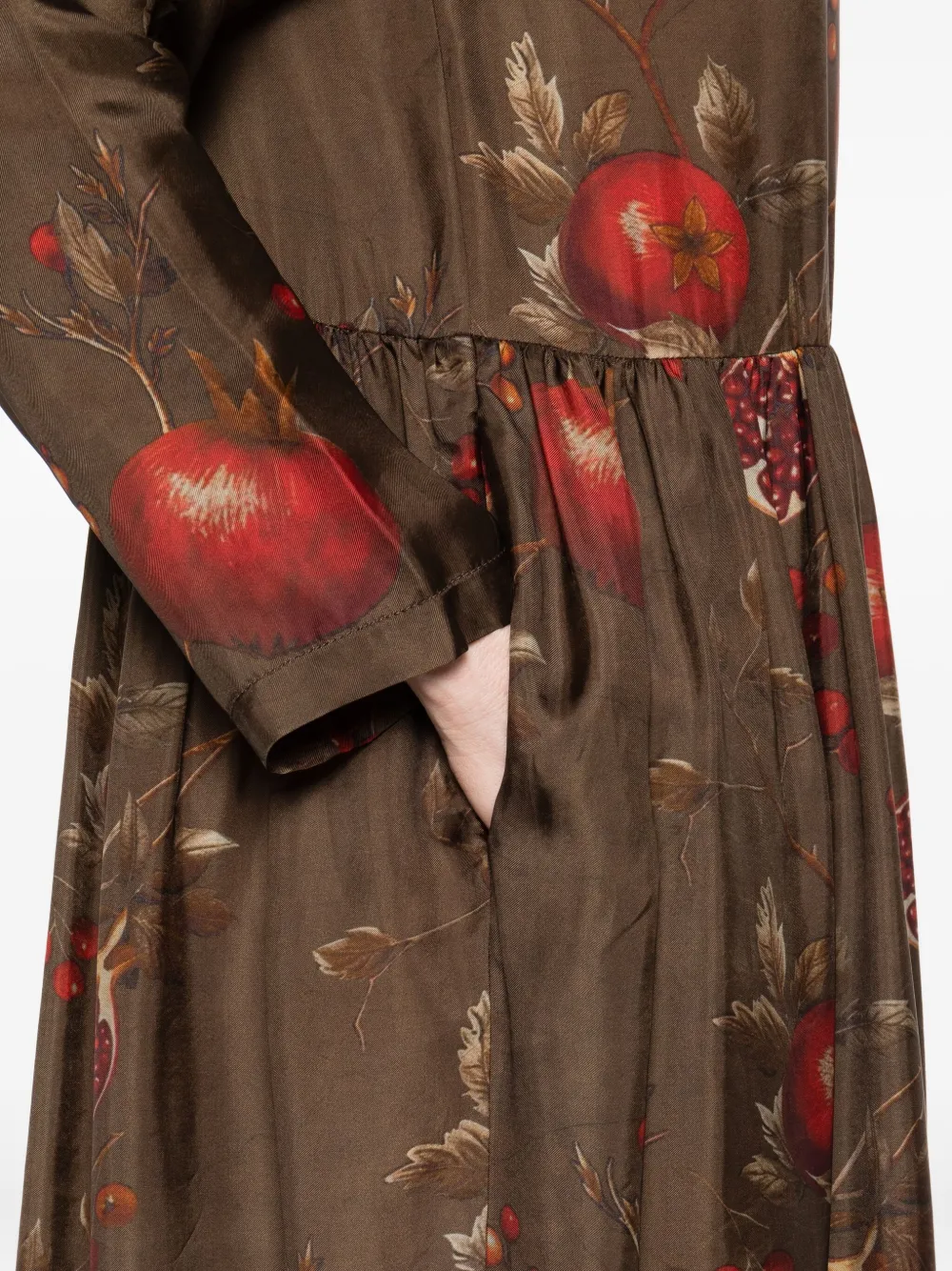 Юбка с принтом коричневого граната, присборенная, рукава три четверти, круглый вырез, длина миди