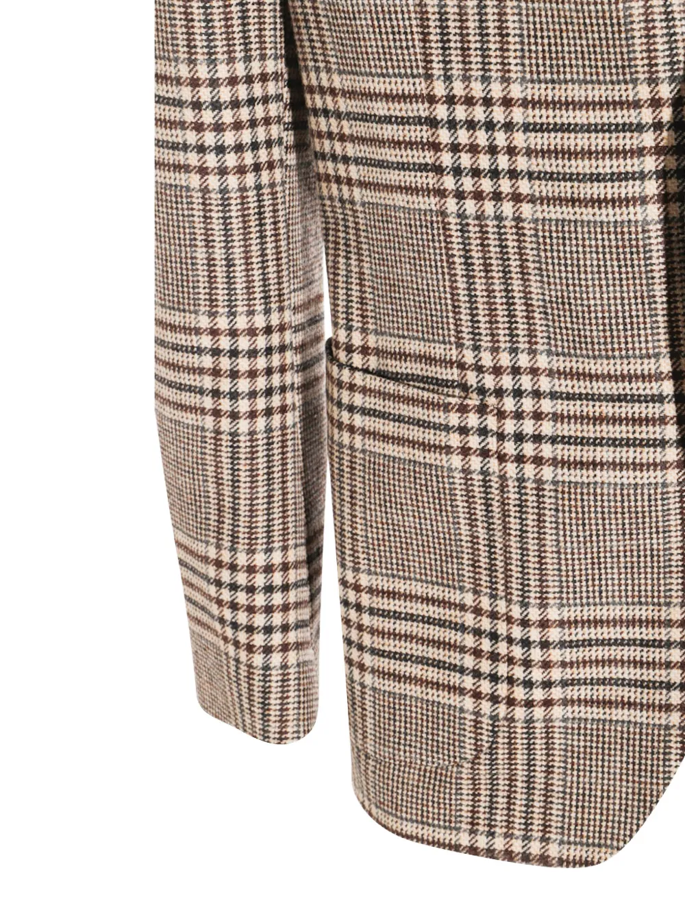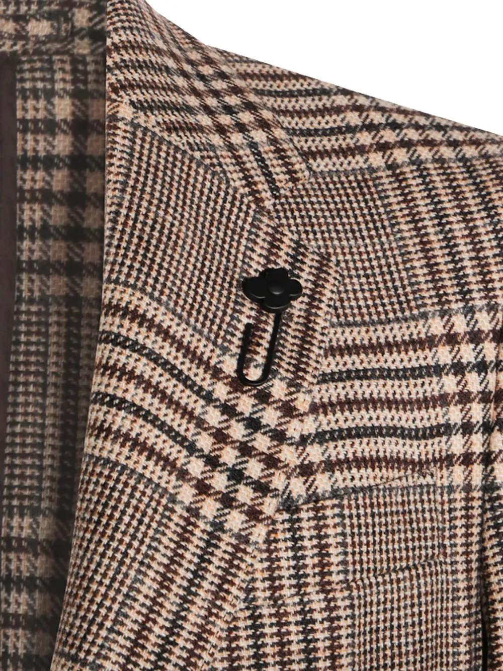 Коричневый клетчатый узор, застежка на пуговицы, накладные карманы, цветочная брошь, зазубренные лацканы