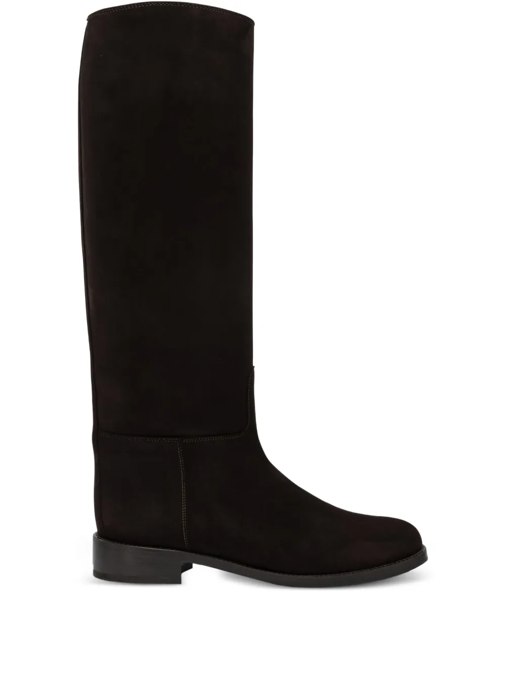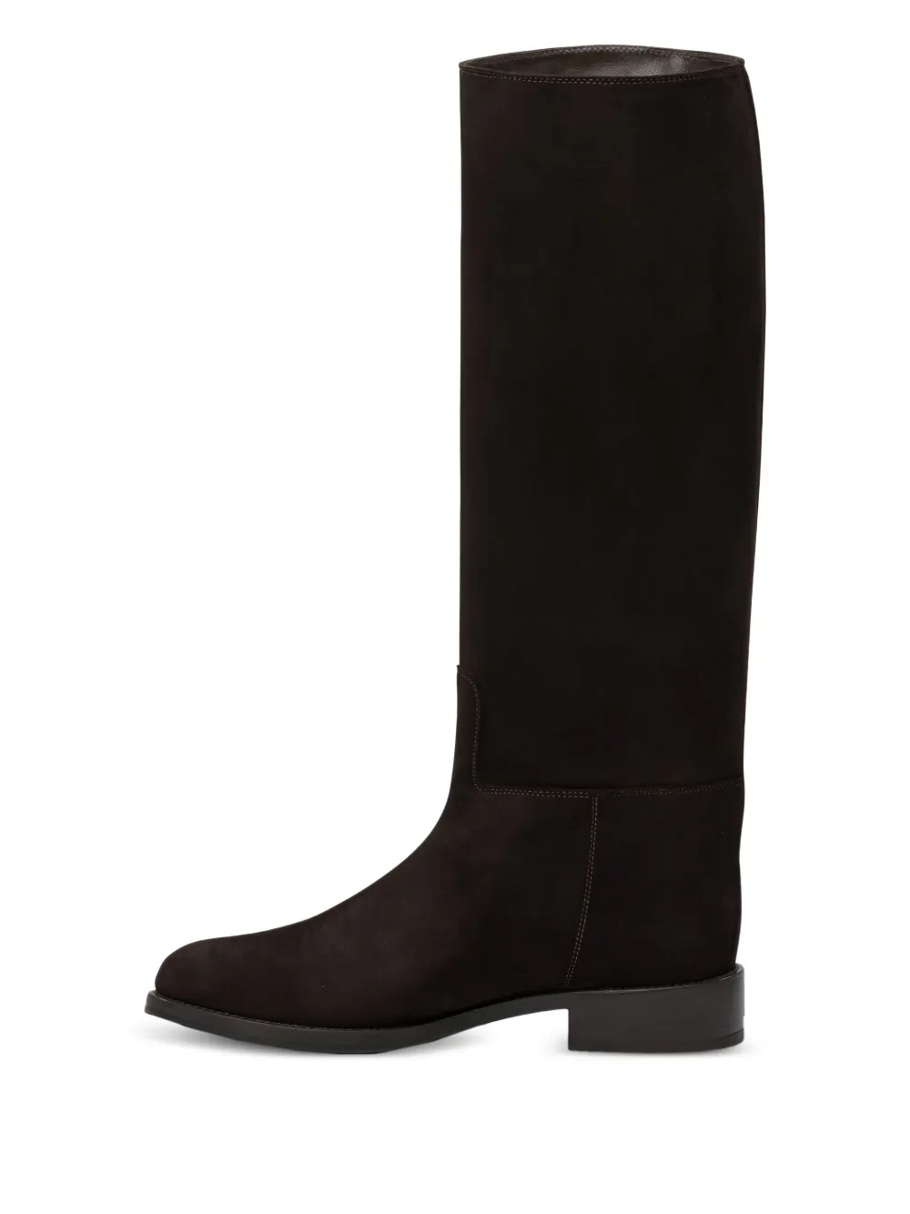 Коричневый замшевый верх, плоская подошва, круглый носок, голенище до колена, фасон надевать вручную