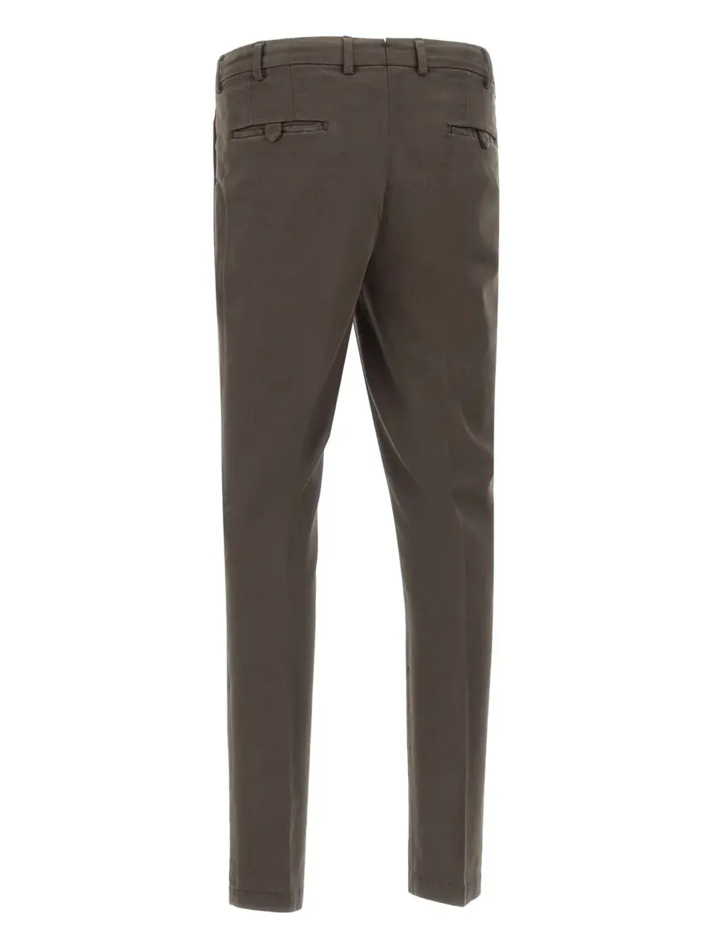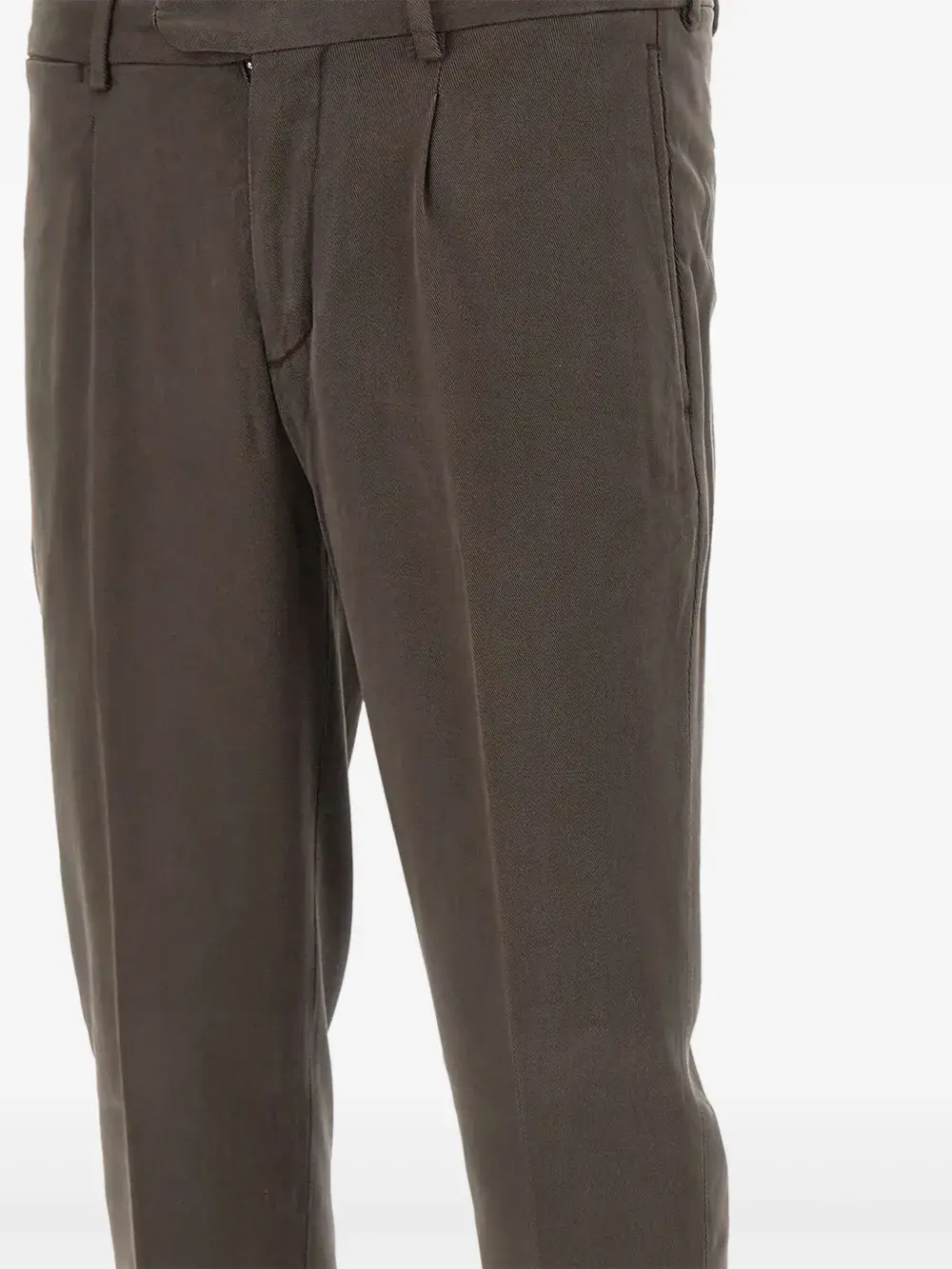 Коричневые плиссированные детали, боковые карманы с листочкой, шлевки для ремня, задние карманы, застежка на молнию и две пуговицы