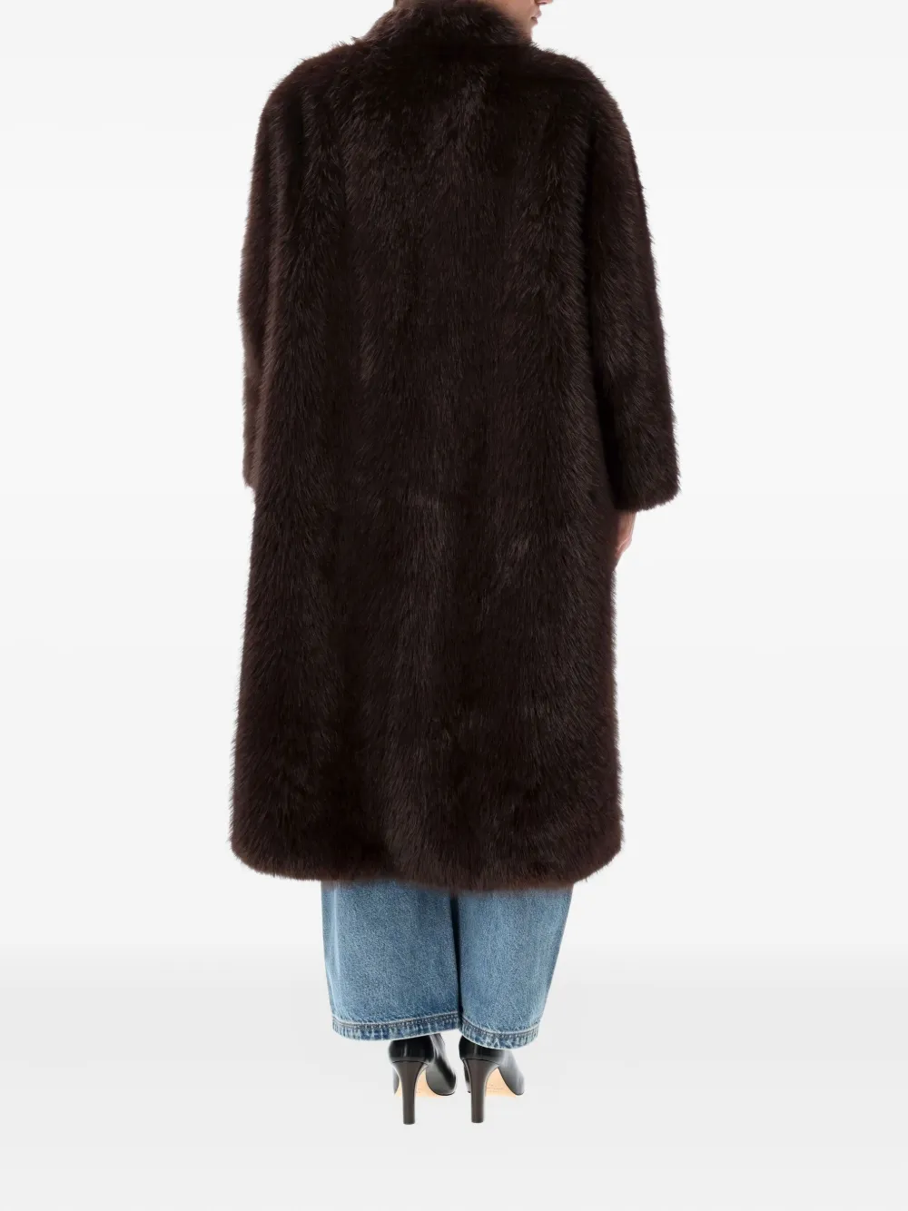 Темно-коричневый удлиненный искусственный мех, V-образный вырез, длинные рукава, застежка по центру спереди