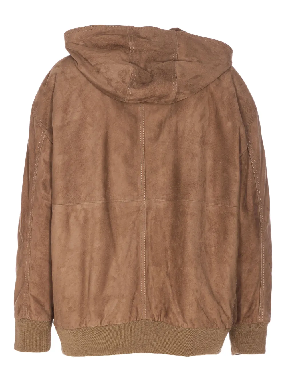 Бежевая замшевая текстура, застежка-молния, длинные рукава, капюшон, вырез горловины, прорезные карманы