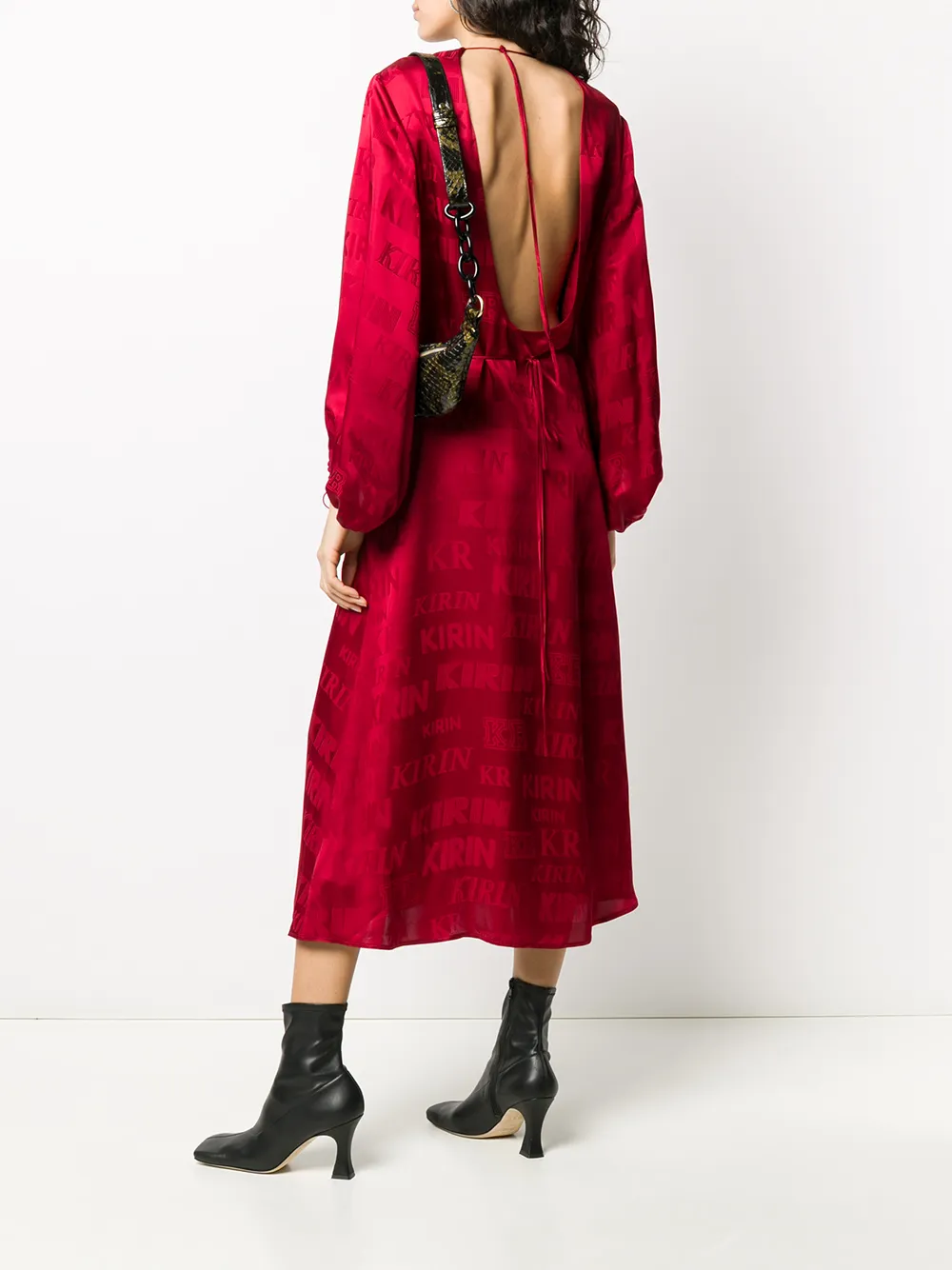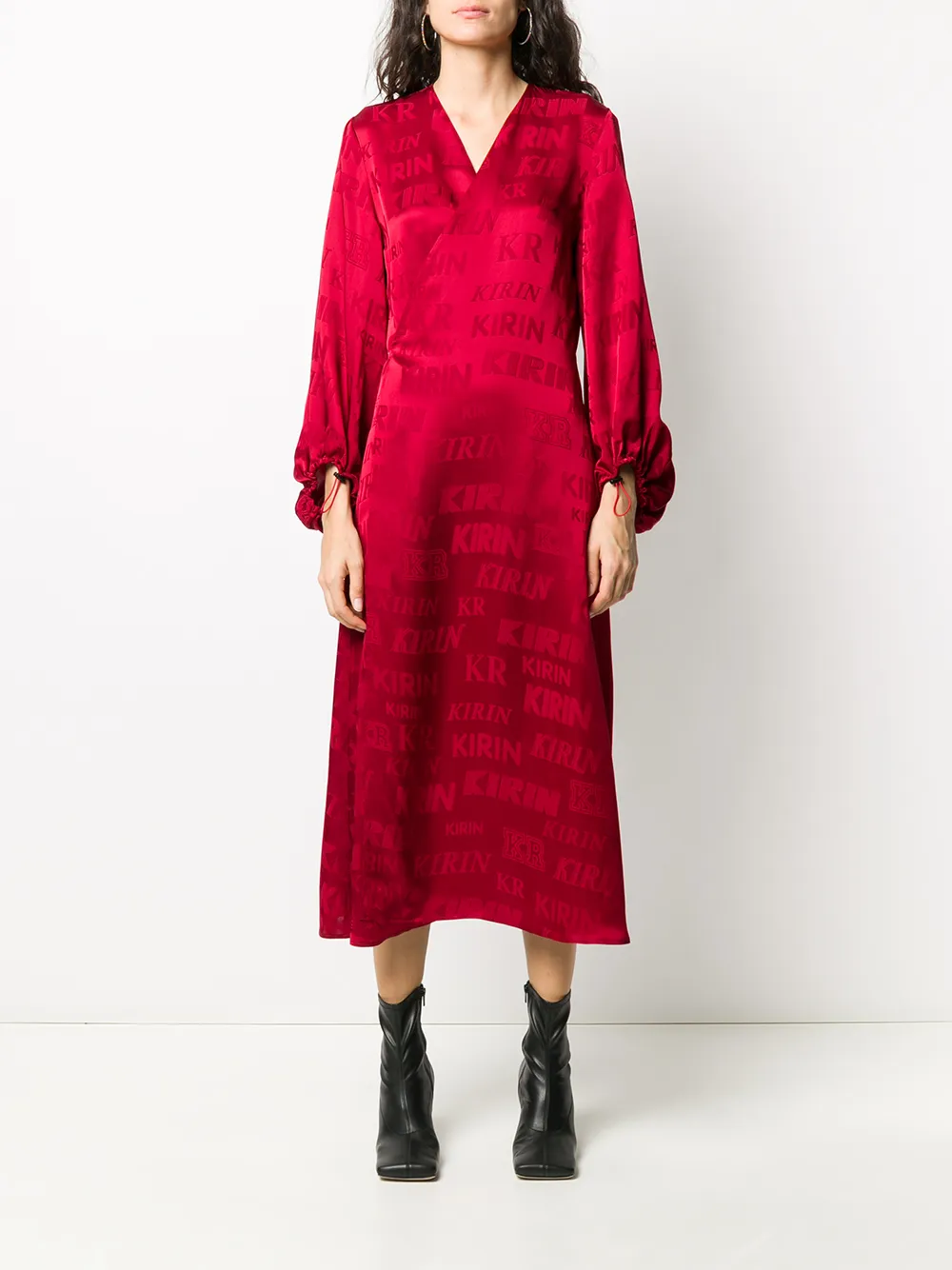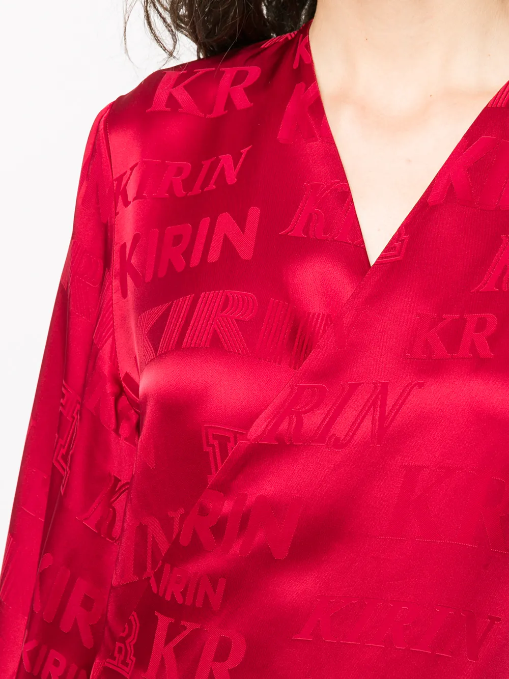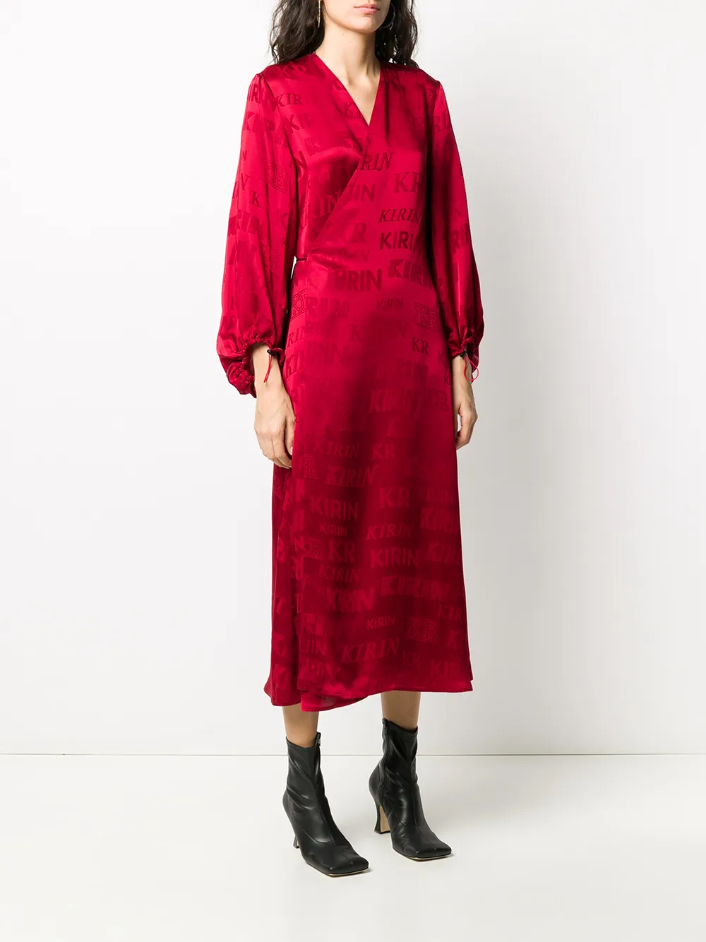 Платье с запахом и логотипом от Kirin Peggy Gou. Сплошной принт с логотипами, V-образный вырез с запахом, открытая спина, присборенный у манжета рукав, застежка на завязке сзади, талия на завязке и средней длины.