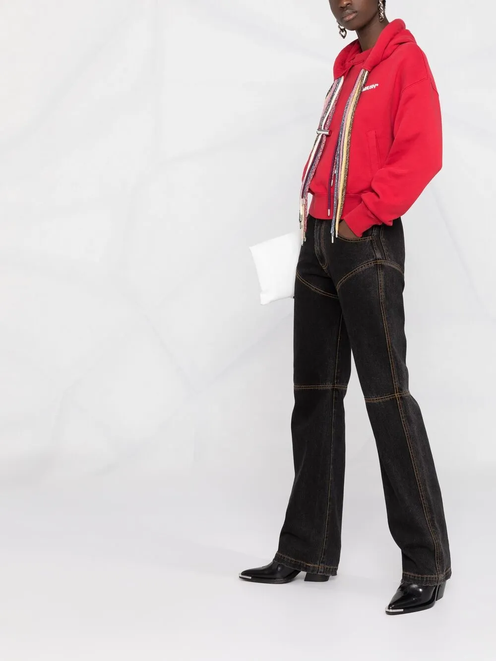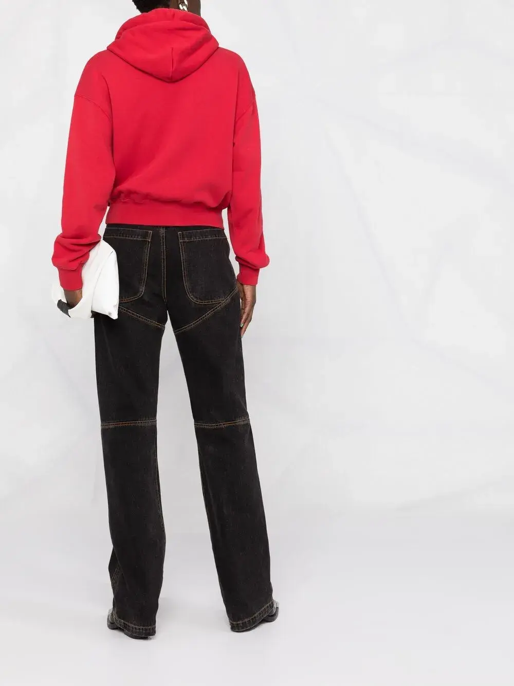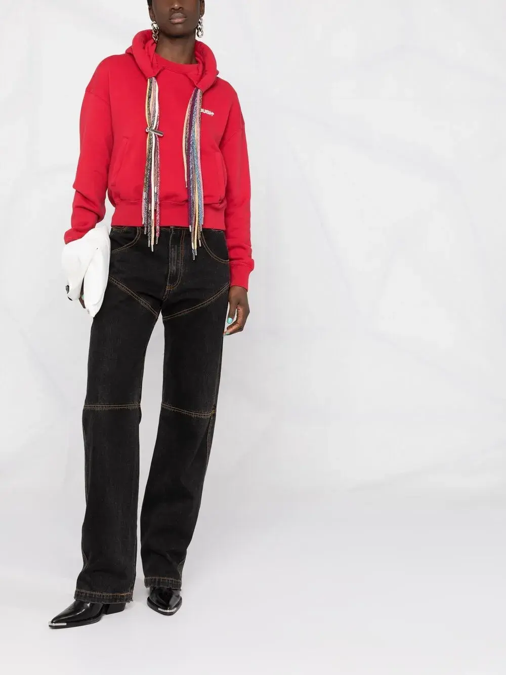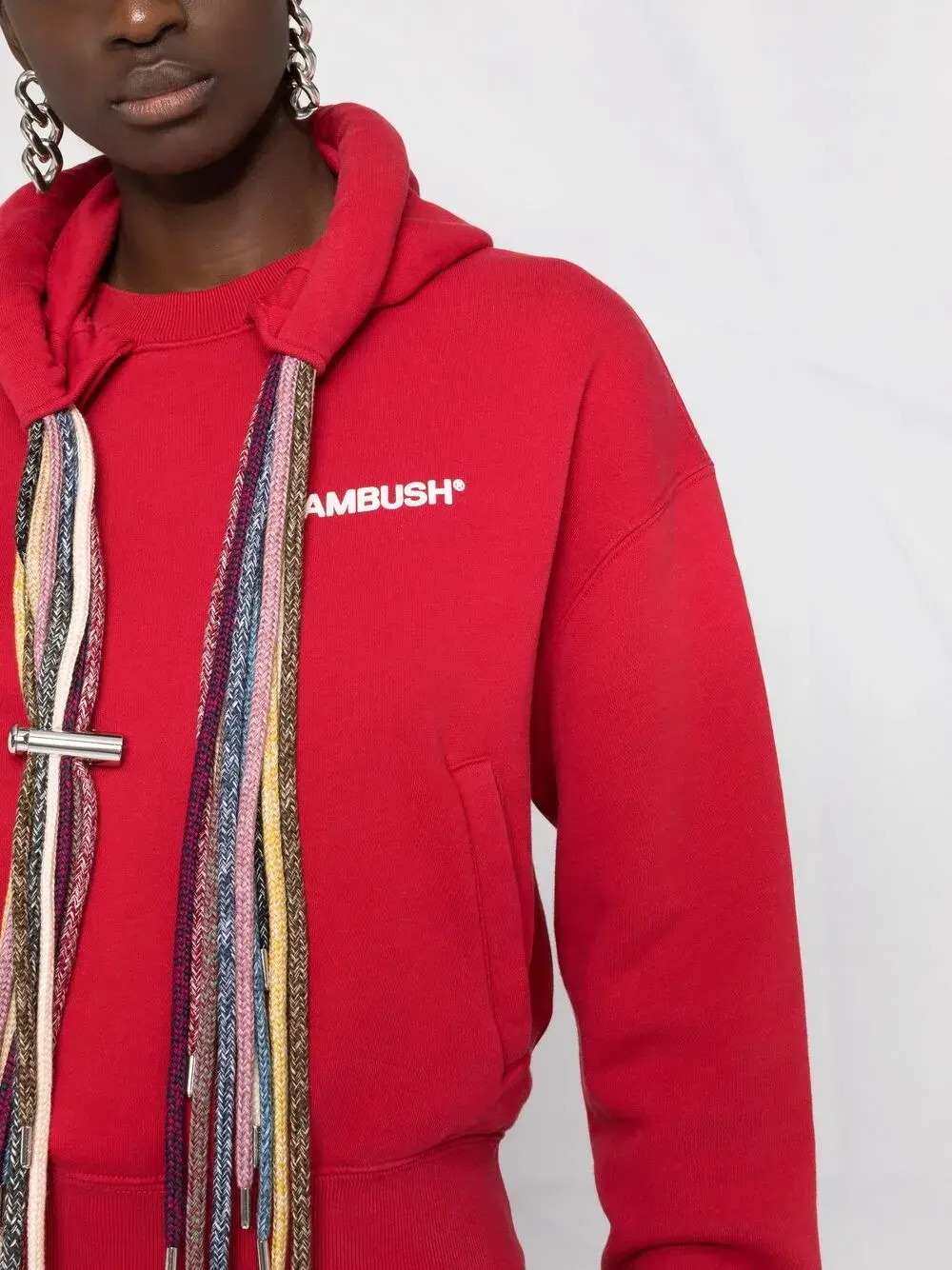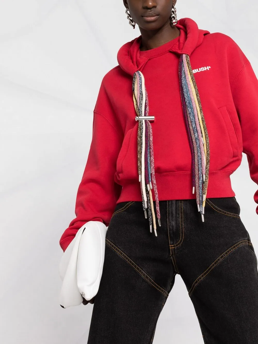 Логотип спереди, затягивающийся на шнурок капюшон, приспущенные плечи, длинные рукава и подол в рубчик. Цвет: красный.