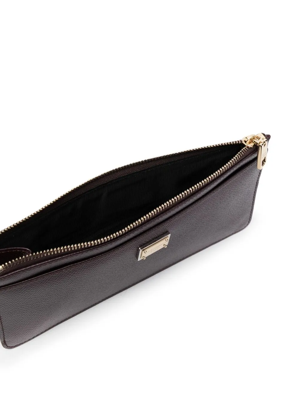 Зернистая текстура, золотистый металлический логотип, застежка на молнии сверху и отделение для карты.