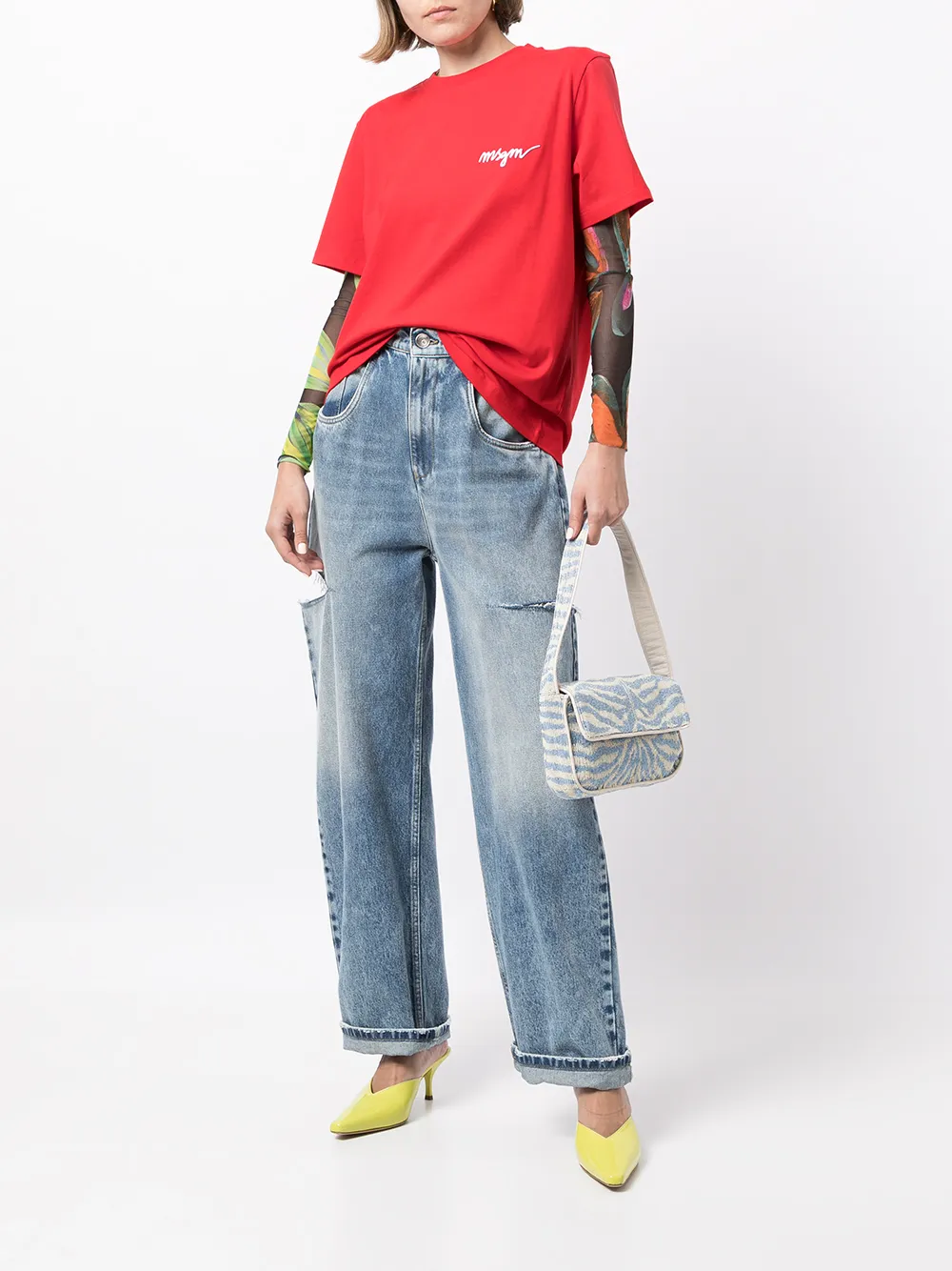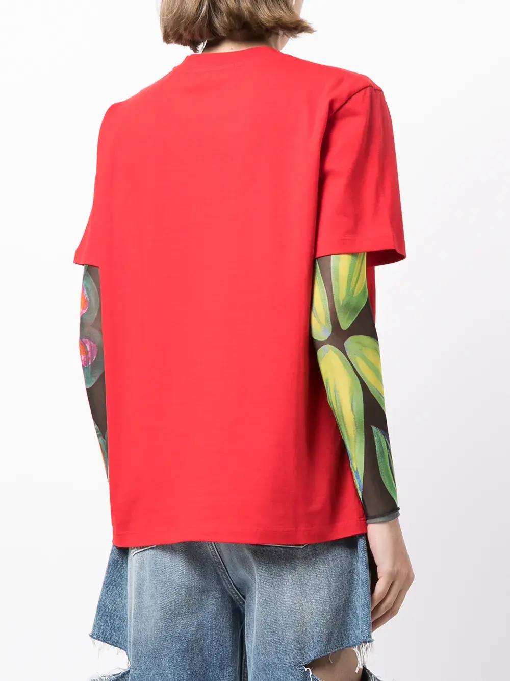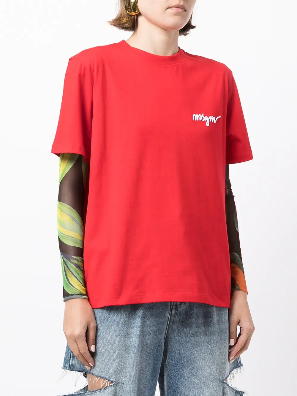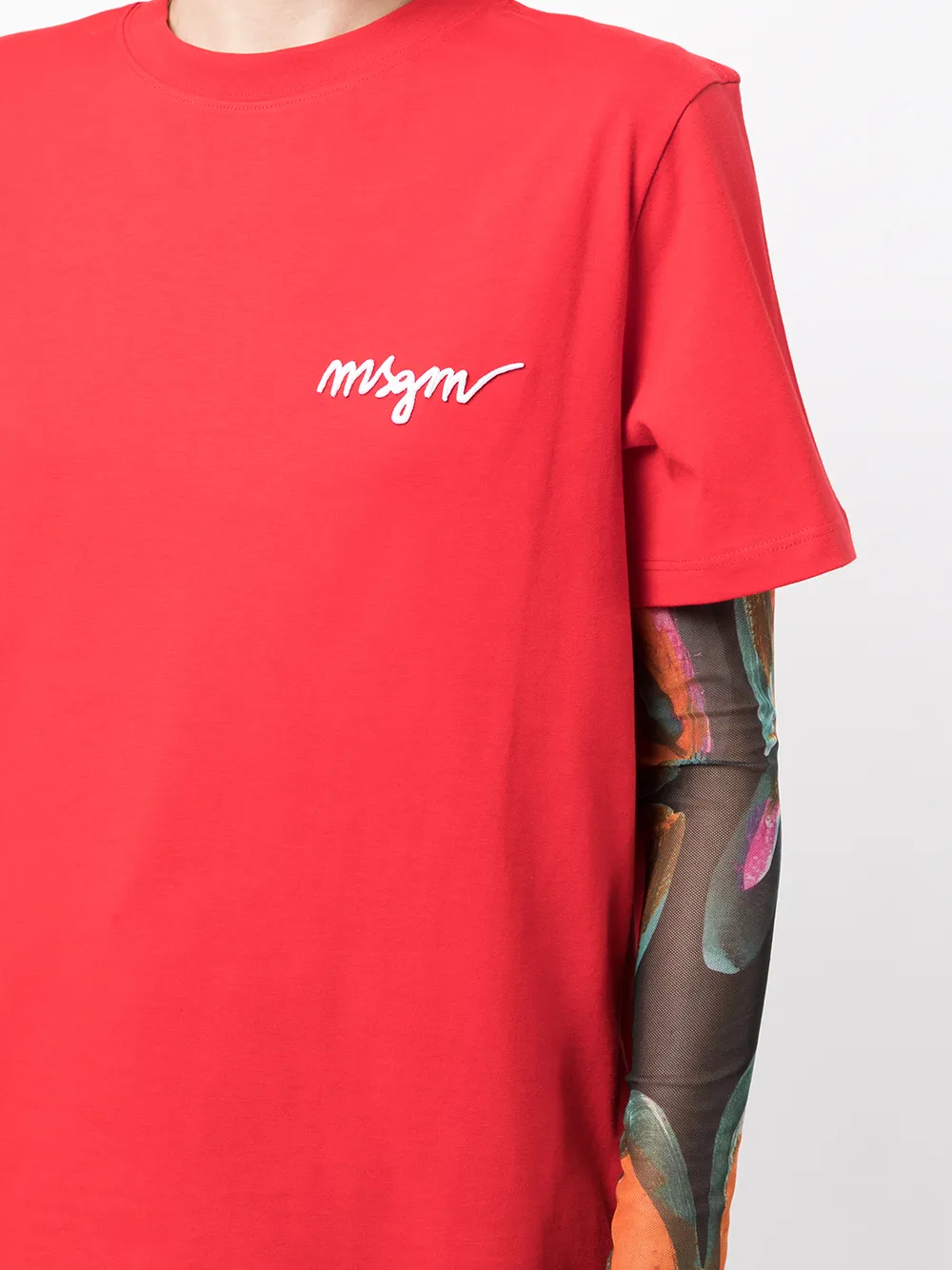 Принт с логотипом на груди, круглый вырез, короткие рукава и прямой подол. Цвет: красный.