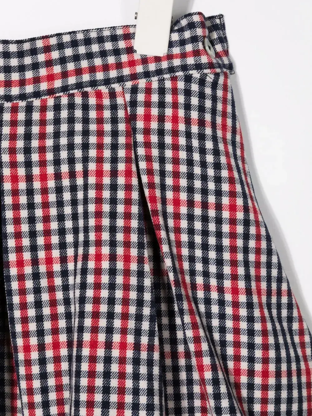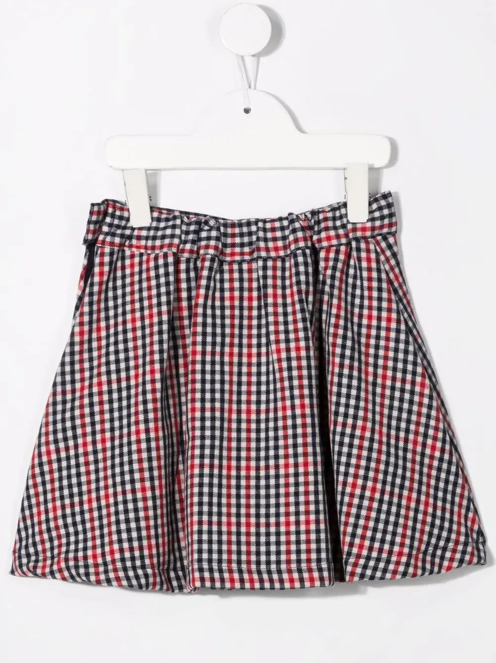 Эластичный пояс, клетка гингем, пуговичная застежка сбоку и прямой подол.