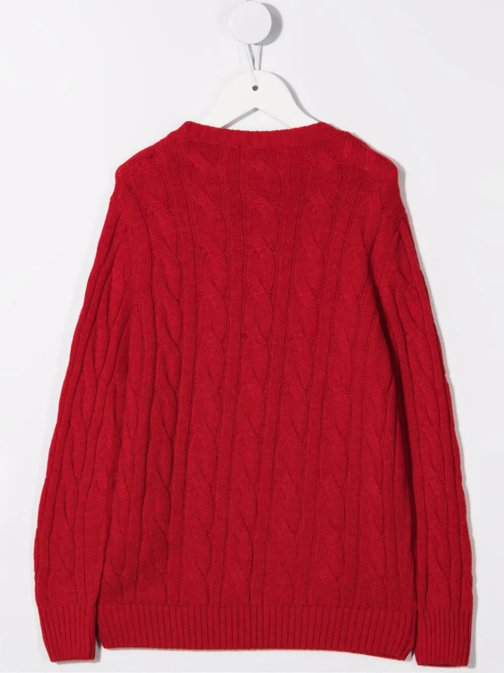 Крупная фактурная вязка, круглый вырез, детали в рубчик и прямой подол. Цвет: красный.