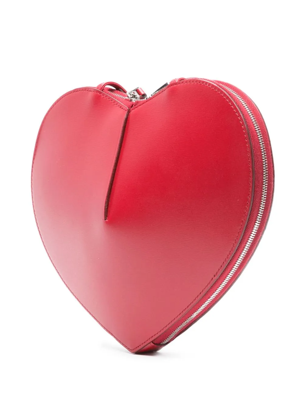Ярко-красный, кожа, серебристый логотип, узор с сердцами, ремень на плечо и основное отделение.