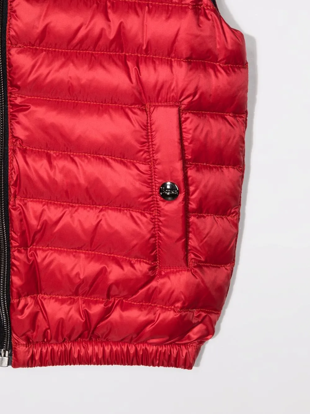 Нашивка с логотипом на груди, дутый материал, наполнитель из смеси пуха и пера, классический капюшон, застежка на молнии спереди, без рукавов, два прорезных кармана по бокам и эластичный подол.