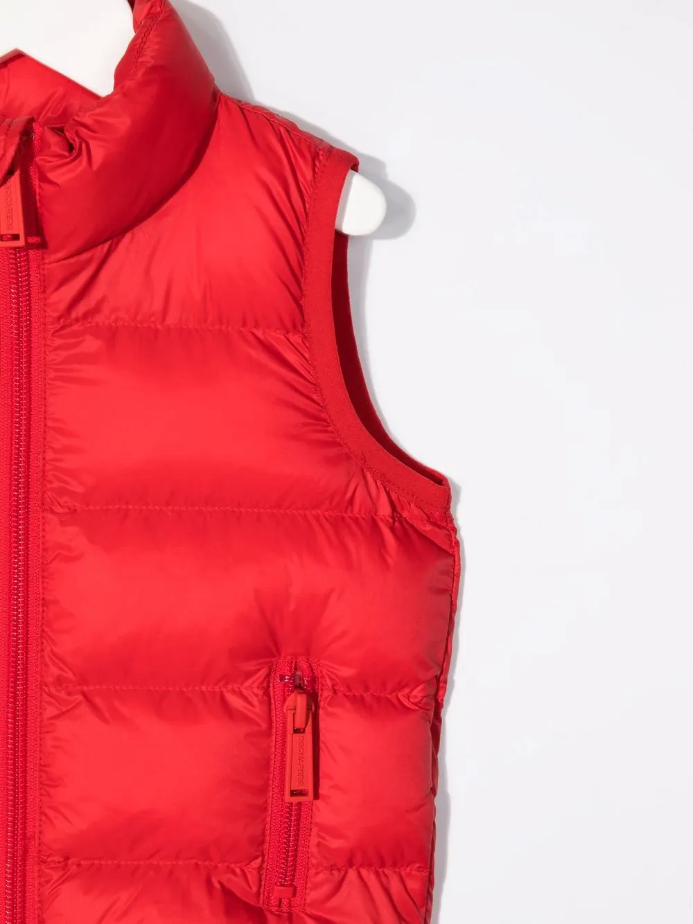 Стеганая модель, передние карманы на молнии, принт с логотипом сзади, воротник-труба, без рукавов и застежка на молнии спереди. Цвет: красный.