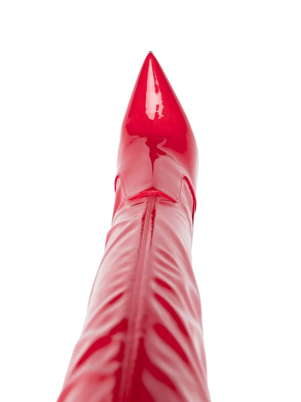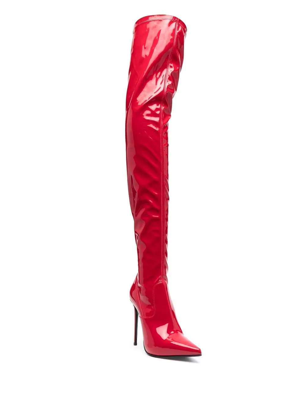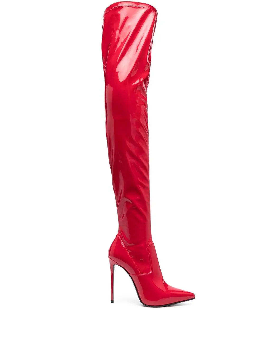 Красный, лакированная кожа, эластичный материал, заостренный носок, высота до линии бедра и каблук на высокой шпильке.