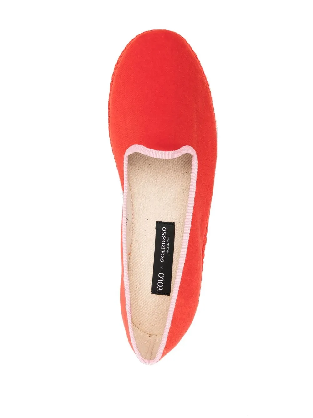 Красный, светло-розовый, бархатный эффект, модель без застежки, закругленный носок, контрастная отделка, стелька с логотипом и плоская резиновая подошва.
