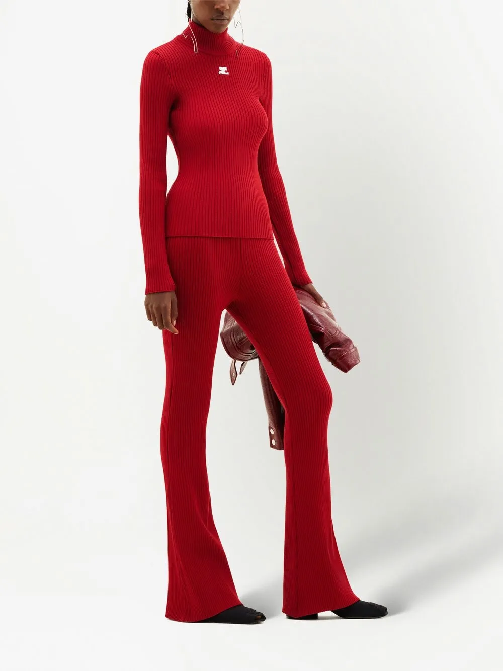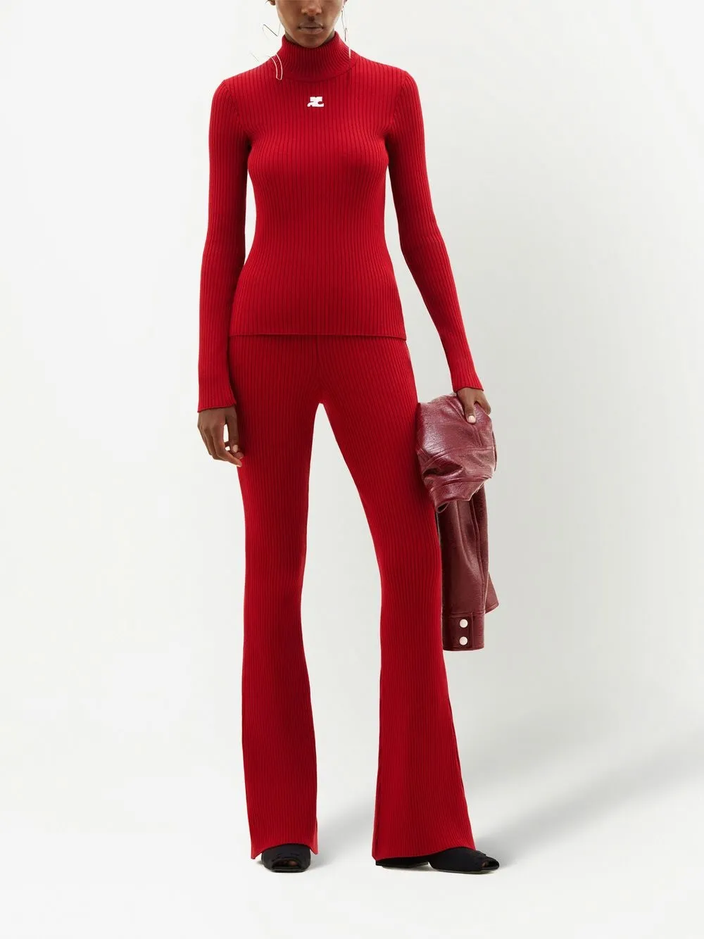 Красный, трикотаж в рубчик, вышитый логотип спереди, завышенная талия, расклешенный крой, эластичный пояс и узкий крой.