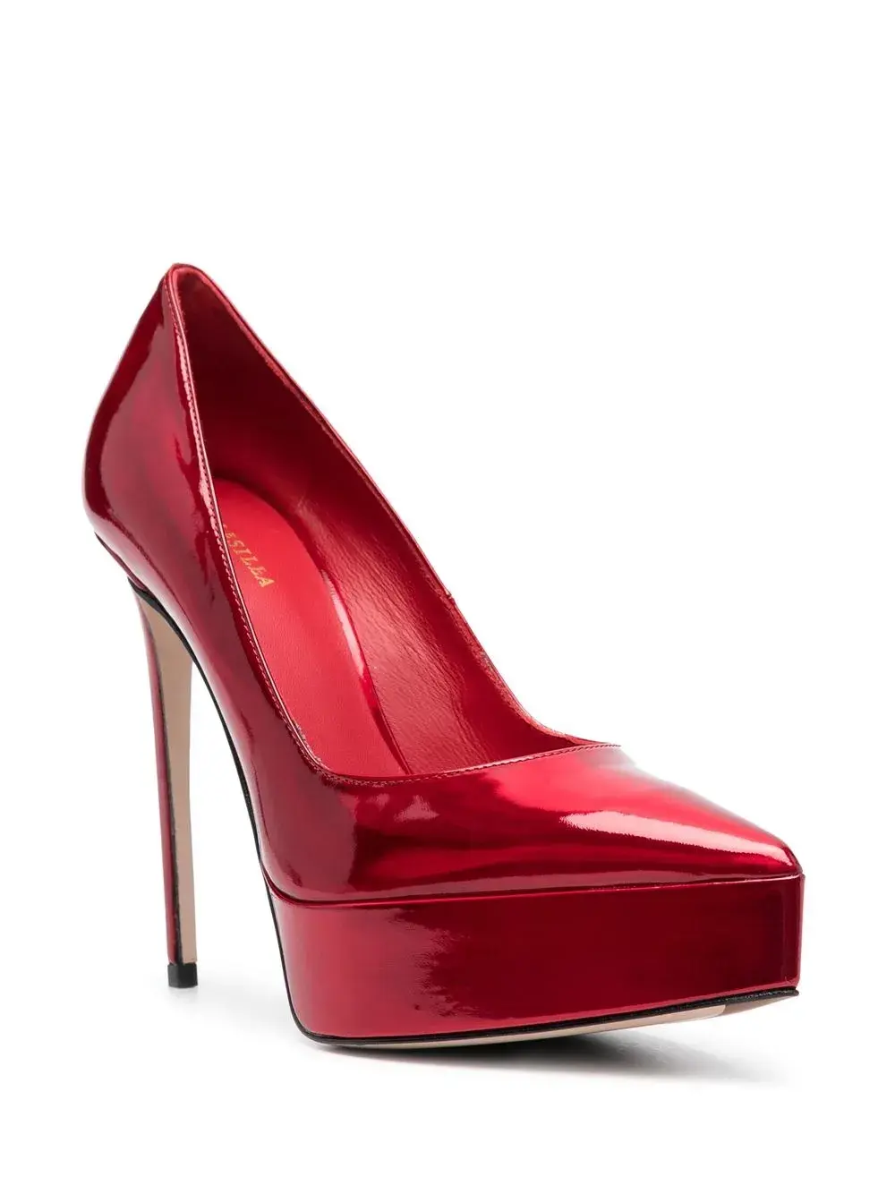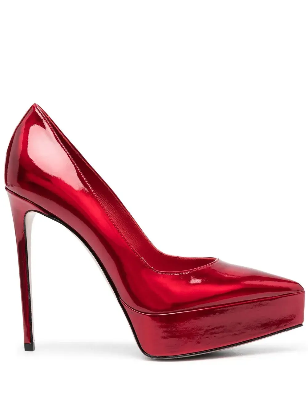 Насыщенно-красный, телячья кожа, лакированная кожа, заостренный носок, кожаная стелька с логотипом, подошва на платформе, каблук на высокой шпильке и модель без застежки.