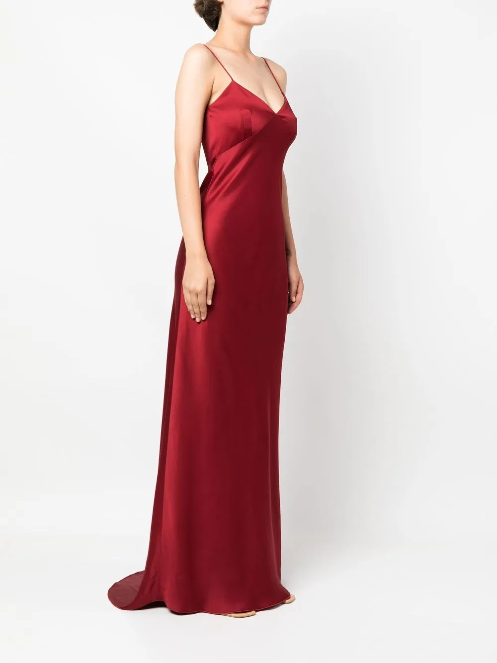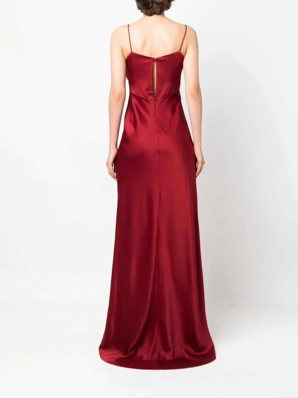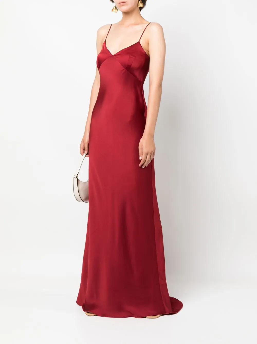 Рубиново-красный, смесовый шелк, расклешенный крой, сатиновая фактура, V-образный вырез, застежка на пуговицы сзади, потайная застежка на молнии сзади, тонкие бретели и длина макси.