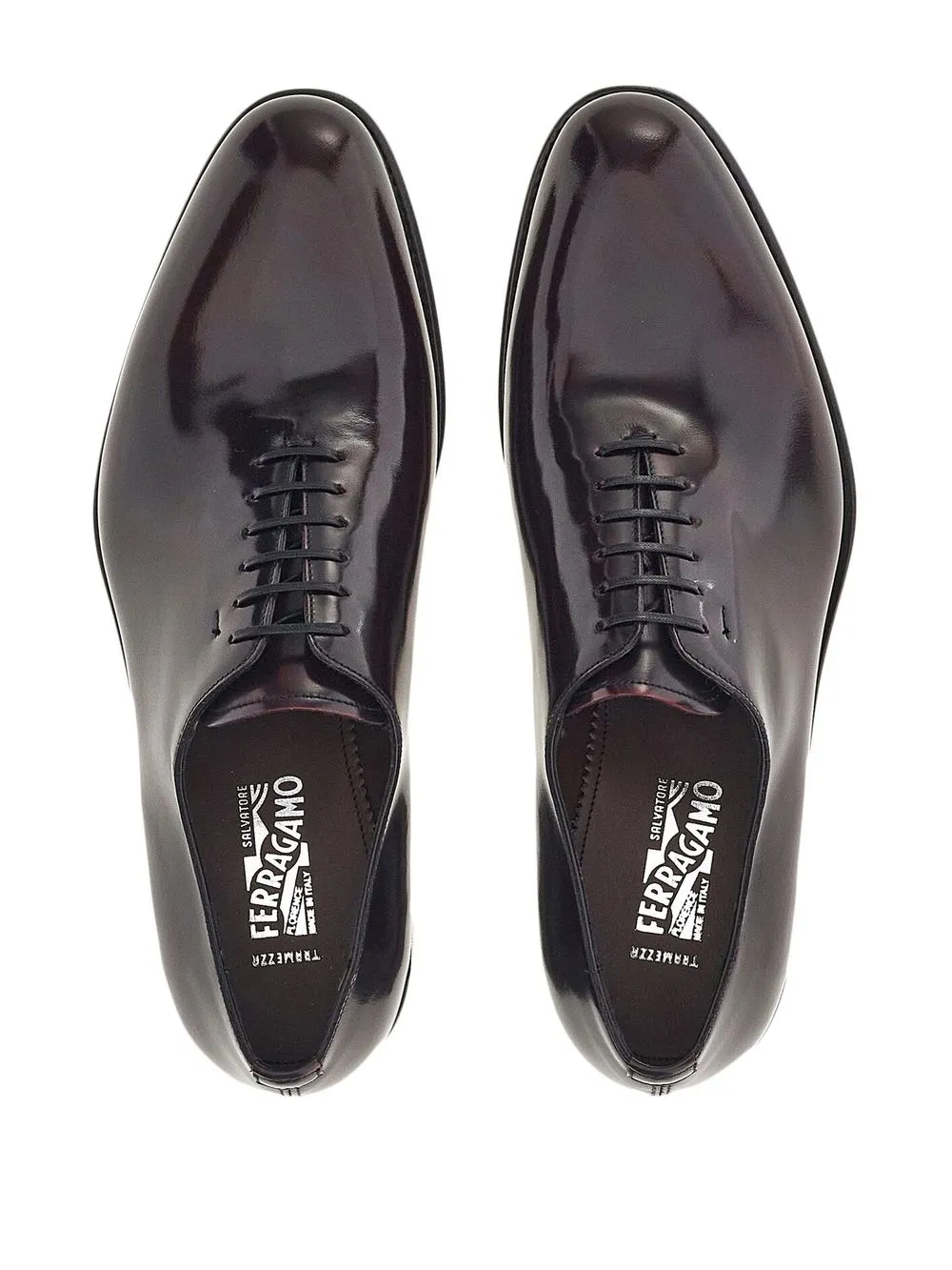Темно-красный, кожа, миндалевидный носок, шнуровка спереди, стелька с логотипом и кожаная подошва.