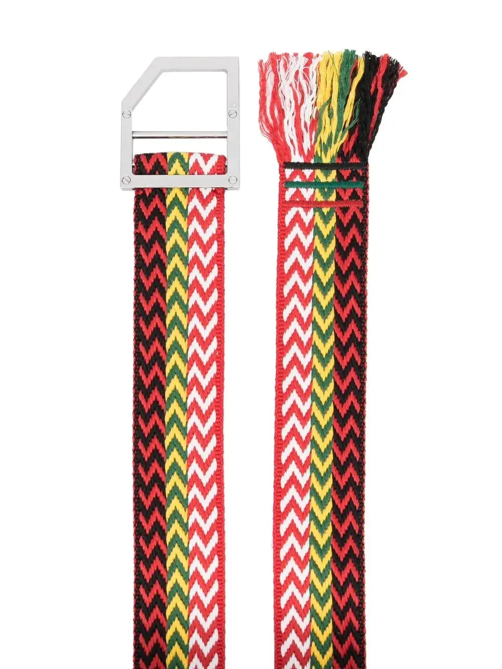 Разноцветный, узор шеврон, переплетенный дизайн, необработанные края и боковая застежка на пряжке.