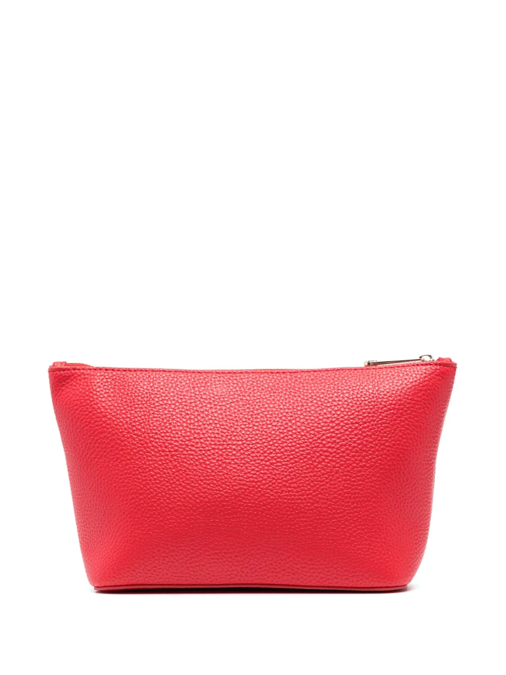 Ярко-красный, искусственная кожа, зернистая текстура, металлическая монограмма, нашивка с логотипом внутри, золотистая фурнитура, застежка на молнии сверху и основное отделение.