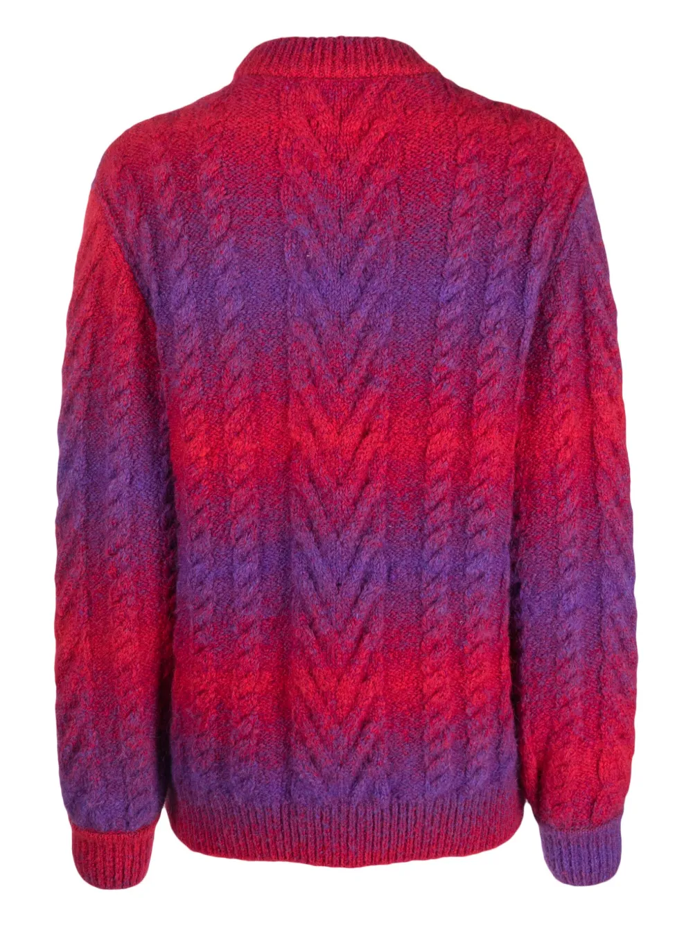 Ярко-красный, фиолетовый, смесовая шерсть альпаки, трикотажный материал, крупная фактурная вязка, декоративная брошь, круглый вырез и длинные рукава.